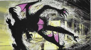 The idea of controlling legends isnât new in this saga. The Seven Unknown Men attempt to control legends when they create Tom Dalt and (possibly) the other neophyte heroes in Seven Soldiers #0. There seems to be a consensus that they were involved in creating the others, even though Shelly Gaynor seems to be ignorant of them, and Dan, weâve seen, bought his rings from Cassandra. Their involvement in the others isnât important, though — they do create I, Spyder, and itâs obvious they are trying to turn him into some kind of mythic figure. Then, when they fail, they use the other accoutrements of heroism for the new batch of seven soldiers, although we havenât seen directly how those things in the cardboard box on the last page of SS #0 got into the hands of the heroes. Morrison has always had this interest in myths and what they mean, and we seem to be getting two opposing roads to legend — on the one hand, Sir Justin is fighting for truth and justice and making his legend live in modern-day Los Angeles, while Klarion is shaping a legend that is significantly darker in modern-day New York. Itâs interesting that Justinâs Los Angeles is much darker than Klarionâs New York. Yet the soldiers that come out of them are diametrically opposed. Klarion is Justinâs dark shadow.
