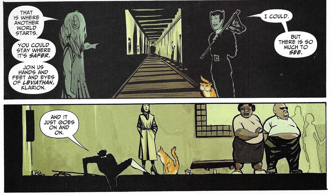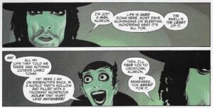 Ebeneezer tells him he has the look of Limbo Town — the Sheeda face. This is another nice little clue about who the Puritans are. Klarion tells him he lives at Bleak Villa, in Shackle Street in Limbo Town. They know how to name things in Limbo Town, donât they? Ebeneezer offers him a choice to go back or come with him before the Horigal recovers, and tells him that Teekl will find him if he has the will, or they will both die. They reach Ebeneezerâs familiar, a big olâ alligator, which is a nice nod to another urban legend about the sewers of New York. As they ride his familiar, called Fear-Naught, through the sewers, Klarion begs to be taken to Croatoan, and Ebeneezer says he will, although he implies that Klarion will be very disappointed. Then Klarion sees a bunch of children on the shore. As the children start throwing rocks at them, Ebeneezer tells him âtheyâre lost children who banded together to form one single creature, greater than the sum of its parts. A dragon with five hundred eyes to see with, five hundred hands to kill you. They know us of old!â The children are called Leviathan, but I wished it had been called Legion. That would have been cool. Klarion thinks this world is the most wonderful place ever, but Ebeneezer tells him heâll soon get bored with it. Is this a comment by Morrison about the ârealâ world, which even they seem bored with? Maybe.