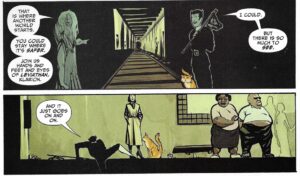 However, according to the annotations (to which you know Iâll provide a link!), Cameron Stewart says that Frazer Irving accidentally put No-Beard in there, even though he shouldnât have been. Technically, it doesnât matter, as the pirates donât show up again, but it adds a bit of intrigue to the saga. Klarion tells Ebeneezer about his father and how he never returned from High Market, and Ebeneezer says, âDid he not, Klarion? Lost, ye say? Now that seems a mystery.â Ebeneezer says a lot of strange things like this. He seems to know Klarion when Klarion tells him his name, and when Klarion asks Ebeneezer if heâs heard of his father, Ebeneezer wonders if Klarionâs stepdad, Ezekiel, did away with his father. Klarion is too fascinated by the chamber where the pirates fought to notice that Ebeneezer knows who Ezekiel is and what his relationship to Klarion is. Again, itâs not important, because Ebeneezer wonât be with us much longer, but itâs intriguing. Klarion, however, has found the radioactive chamber, and thinks itâs pretty freakinâ grand. He finds the die that the pirates fought over (why didnât the âwinnerâ take it with him?) and Ebeneezer tells him that this is the house of Croatoan, where the witch-men come to be initiated into the âone great and terrible truthâ: there is no Croatoan. He tells him that if he did exist, he âescapedâ and left them alone, and only his âdreadful chains remain.â Klarion thinks this is great, because then he can remain a boy forever! Ebeneezer tells him heâs weird, which he is. This ties into the fairy tale subtext running through the saga — the wicked stepmother and the persecuted girl, and now a Peter Pan thing. Morrison once again contrasts Klarion with the other soldiers — they are working through personal issues and trying to become heroes, while Klarion just doesnât care about that.