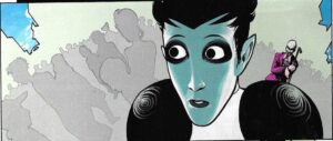 Klarion, meanwhile, is riding in a Pumpkin taxi, which we first saw in The Manhattan Guardian #1. Thereâs a connection, obviously, to the fairy tale nature of this epic — for these children, midnight strikes when they turn sixteen and go through to the Red Place. The children he is with are punks like Klarion, splashing a group of prostitutes and drinking beer. Hooligans! They end up at a museum of superhero history, which has to remind us, just a bit, of the Hall of Justice from the Super Friends. Or is that just me? Klarion pukes because of his experience in the taxi, but then asks to do it again, which the gang thinks is great. The driver, Billy Beezer, who is all pimped out (making the splashing of the prostitute somewhat ironic), mentions Goldenboy, who taught the gang members. Weâll see Goldenboy soon, but his name reminds me — again, it could be just me — of Sir Justin, who is, after all, decked in golden armor. Klarion tries to prove his worth by sending Teekl into the museum. One of the gang is a girl named Murderella-rella — another reference to Cinderella. We also learn that Billyâs gang is called the Deviants, and when they turn sixteen, they go to Team Red. More interesting stuff weâll get to in time. Klarion looks through Teeklâs eyes and sees âa great empty hall of light, filled with flags for men and women to wear.â According to the annotations, the costumes on the left are for Stripesey, the Star-Spangled Kid, and the Crimson Avenger, all members of the original Seven Soldiers of Victory. The one on the right is Miss America from the Invaders. A Marvel character! What the heck? [Edit: According to the comments on the original post, this is the DC character, although their costumes look awfully similar.]