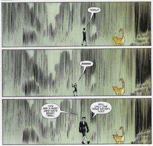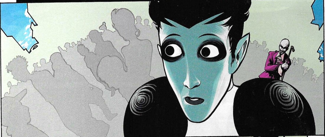 He tells Billy that âcurses come to this one [Klarion] as naturally as breathing does to you and me.â We know he knows quite a bit about Limbo Town, but itâs interesting that he knows so much about Klarion. Is he already subtly grooming a replacement? Then he tells Klarion that âwe keep our familiars small and we keep them inside where I come from,â which Iâm sure many people (including people at the annotations) took as a reference to Philip Pullmanâs excellent His Dark Materials trilogy (The Golden Compass, The Subtle Knife, and The Amber Spyglass). Thereâs no reason to go that far, however. We see at the end that Teekl serves as Klarionâs conscience, so Melmoth could just mean that our moral compass is inside us, rather than externally as a talking cat. Itâs still interesting to hear Melmoth talking of âfamiliarsâ so, if youâll forgive the pun, familiarly. Billy gets all grumpy and throws a can of Coke at the cat (product placement!), and one of the Deviants trips him as he chases Teekl. The Frankenstein kid says, âWilliam, fear is anger, anger is failure and the beginnings of being a grown-up.â Billy turns sixteen at midnight, so he will âbecomeâ an adult then and join Team Red. This is another interesting statement that Iâll get back to. Youâll notice there are seven Deviants now that Klarion is there, even though they will lose one at midnight. Is six the optimal number because they arenât âgood guysâ? This seems to be the idea throughout — âgoodâ teams have seven members, but âbadâ ones have six. Billy fights Klarion, and when he gets him on the ground, Klarionâs eyes light up with an unholy glow and he asks Billy, âShall I tell you the hour and date of your death?â Billy, not surprisingly, backs down. What does he care? Heâs sixteen in three hours! This is just another clue that Klarion plays very, very nasty. Melmoth likes it.