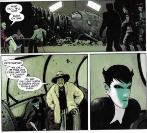 So the kids fool the two old guards with misdirection. They appear to know the Rules of Magic quite well. Murderella-rella mentions an âavenging ghost,â which doesnât exist, but fits a few characters in the saga, such as Ali Ka-Zoom (sort of). The kid who looks like Frankenstein (I canât remember if he gets a name, and if he does, Iâll figure it out later) breaks into a glass case containing a âweather generator.â Hey, remember Hurricane Gloria, raging down in the Gulf of Mexico? I wonder if itâs a coincidence. Iâm sure it is, because Morrison nevers does stuff like this, right? In another panel we see an âIron Handâ on display, which also comes up again. This is why reading a Morrison comic is fun — nothing is wasted. Billy Beezer gets the keys to the room displaying âSuper Machines of the Golden Age and Beyond.â I like how in Morrisonâs DCU (and, I suppose, the DCU at large, considering the presence of the JSA), they are as self-conscious about the âagesâ of heroes as we are. Billy and Klarion enter the room and are confronted with the âsapper drillâ from World War II. Although we see Batgirlâs motorcycle and a Blue Beetle flying bug in the room, apparently the sapper drill, which would have been used to undermine trenches and perhaps dig under fortifications, is a Morrison creation. Billy hands Klarion a manual (presumably the operating manual of the drill) and a map. Klarion is to drive the drill to a given location. On the next page, Klarion and Billy arrive at Melmothâs underground headquarters, where two of his toughs have been discussing movies from a feminist viewpoint. I love stuff like that, and Morrison does it very well — humanizes ancillary characters just a bit. Klarion does not look happy, but itâs unclear if heâs not happy because Billy is a jerk (how do you like it, Mr. Dish-It-Out-But-Canât-Take-It?) or because he realizes Melmoth is going to subjugate Limbo Town. Probably the former.
