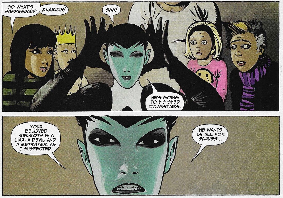 The other children can continue to exist in this fairy tale or seize responsibility and get out. The idea of Klarion replacing either Billy (as leader of the gang) or Melmoth (as ruler of the Sheeda) is also part of fairy tales, which often deal with children (usually girls, but Klarion is kind of androgynous anyway) replacing the older generation, and that generation fighting back. We have seen Gloriana Tenebrae freak out when Misty is coming of age. What is Melmothâs game with regard to Klarion? Weâll find out eventually.