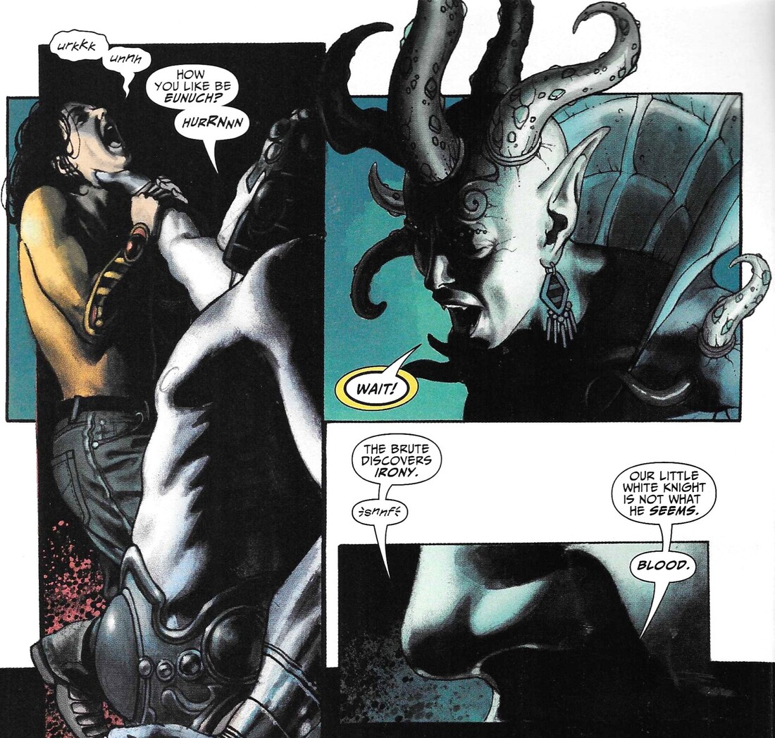 The Queen suddenly smells “the blood of a womb,” and realizes that Galahad is employing unintentional irony, because Justin is actually Justine [Edit: Justina?]! What? How could that be? We’ll get back to this revelation, obviously. Galahad bashes Justine while a tiny messenger “from the east” arrives riding a lizard. He tells the Queen that her husband, “dark Melmoth,” still lives, which causes her to retire to her chambers to ponder this new development. Melmoth, of course, is stirring up some trouble in New York with Klarion. Who knew he was Gloriana’s husband? Isn’t that cute? The Sheeda language, by the way, resembles (is?) Ogham, an old alphabet, and thanks to our own Dread Lord and Master, you can read what the Sheeda are saying. Except for this first time, it’s nothing important, although it is funny. As she leaves, the Queen tells Galahad to break Justine to slavery, and make her beg to love the Queen. We’re back to this fairy tale motif, as well as the idea of control. The easiest way to control someone is to make them love you. That’s what the Queen wants. Interestingly enough, in order to salute the Queen when she leaves, Galahad puts down his swords. Who’s that reaching for them? Why, it’s Justine! Stupid, stupid Galahad.