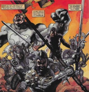 The idea of the Seven Virtues contrasted with the Seven Sins has come up before, and here is the living embodiment of the corruption that can occur. Incidentally, back in the good old days (when Rome ruled the civilized world!), virtus meant “goodness,” but its primary meaning was “manliness.” Only later did it acquire the more simpering definition of today. Vir, in fact, is the Latin word for “man.” Galahad has lost his manhood as well as his goodness. So Justin has to fight Galahad — considering what’s coming, it’s the “unmanned” knight versus the “never-a-man” knight. Galahad has some keen characteristics. He has a pentagram etched on his chest. A pentagram has many meanings, but, interestingly enough, it appears on Sir Gawain’s shield in Sir Gawain and the Green Knight. Galahad is gray, which evokes both the golem and Solomon Grundy — an effect heightened by the fact that he’s obviously not all there in the head. On page 2, Bianchi draws him with six arms (four are after-effects of moving, but they’re still there) and, of course, two legs — eight limbs (like a spider). I’m not the only one who sees freaky crap like this, I know!!!! The Queen is overconfident — she says that the last time they came, humanity was strong and vigorous, and even then they could barely resist the Sheeda. Galahad shatters Justin’s sword (which can’t be Caliburn, can it? it looks like it, but what exactly happened to Arthur’s sword?) and rips that ugly, shapeless tunic he has worn since he met Ali Ka-Zoom. The Queen, self-aware as ever, asks Tom Dalt if he appreciates the metaphor of heroes fighting each other while the Sheeda swoop in. Dalt enigmatically answers, “A great day, milady. For some.” Oh, that Tom Dalt! Always conniving!