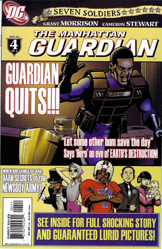 The grand theme of this issue is, of course, growing up. The saga has concerned itself with becoming a hero as a metaphor for growing up, but in this issue, we see the both the darker side and the brighter side of growing up. In the issue âpriorâ to this, we see Justine go through a transformation that, as Ragnell argues, marks her journey from girl to woman. In this issue, Morrison returns to this idea that adulthood somehow marks the loss of heroism, as the kids grow up and lose their youthful exuberance and innocence, highlighted, of course, by the sexual relationship between Suzi and Cap. The Time Tailor, like Melmoth, makes repeated references to growing up, and makes it sound horrific. Adults, after all, have secrets, and itâs this that binds them to places like Slaughter Swamp. When Ed was a child, he roamed the streets freely, fighting injustice. Now that he is an adult, he hides himself away, because heâs ashamed. The Newsboy Army are not, in the final analysis, true heroes, because of the fact that they donât grow up properly. In the present, after years of wandering in the wilderness, is when they become true heroes. Ed makes sure that the âSeven Soldiersâ concept might work this time.