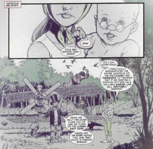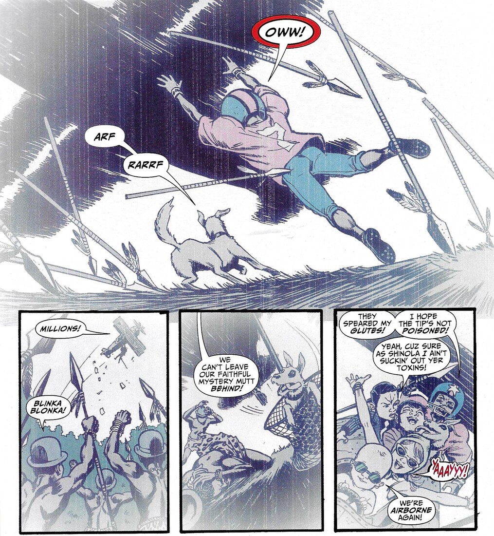 The Newsboy Army is trying to fix their plane, which has crashed in the jungle. Baby Brain — Ed Stargard — is trying to explain how they should fix it while being held by Lâil Hollywood. Iâm surprised that Lâil Hollywood didnât show up at the self-esteen workshop with Zatanna, but she does appear in Bulleteer. The black kid with the top hat on couldnât possibly be Ali Ka-Zoom, could it? Well, of course it could be! On the tail of the plane sits Kid Scarface, otherwise known to us as Vincenzo, the undying don, and on the wing is Chop Suzi, who doesnât have a pleasant fate, as weâll see. Suddenly Millions, the richest dog in the world (Ali Ka-Zoom mentioned him in Zatanna #3), and Cap (whose âofficialâ name, I guess, is Captain 7 because of his jersey number, but nobody ever calls him that) come running out of the jungle, chased by cannibalistic natives wearing bowler hats. Cap is carrying a Cessna engine that the natives have been worshipping as a god since âtheir ancestorsâ brought in there on a safari package tour. This is interesting, because it implies that ânativesâ arenât actually natives, but tourists who went native. This gives this little vignette a very Lord of the Flies vibe, as well as a Peter Pan vibe, and weâve seen that Klarion, among others in this saga, has a curious Peter Pan complex. This also reminds me of The Gods Must Be Crazy, which Iâve mentioned before in relation to Klarion, as well as the Jon Frum cargo cult (although that might just be me). Notice that Cap also says âWouldja believe âŠâ when he tells them about the engine. We must suspend our disbelief even more! As he throws the engine toward them, he asks, âHow lucky are we?â Not very, as it turns out. Kid Scarface catches the engine, Ali Ka-Zoom distracts the natives with stuff coming out of his sleeves — doves, cards, and the like — and Baby Brain tells Chop Suzi to get the engine installed.