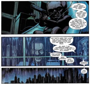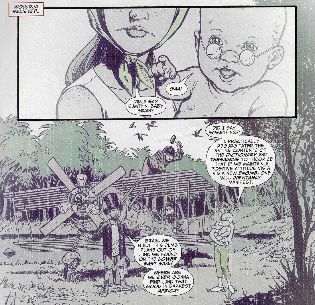In this issue, Morrison also does something else they enjoy doing — using Silver Age ideas but showing us the dark underbelly of it. The world of the Newsboy Army is shiny and bright, as they take their oath in front of the UN building, full of hope. We never expect to see Mo Colley plucking the eyes out of cops or getting gunned down, and we donât expect the sexual undercurrent that runs through the story. Even the prologue, in âdarkest Africa,â has a disturbing edge. Morrison knows that when we read Silver Age stories today, we read them with a jaundiced eye, so they do it for us. Itâs disturbing, because we can never be sure how explicit the writers of that time were being. Here, itâs obvious how explicit Morrison is being. It ties into this idea of growing up. We can no longer enjoy olde-tyme comics like we did when we were children, because we see things differently. Whether this is a good thing or not Iâll let others debate, but itâs certainly true. Morrison is one of the few writers who is very good at setting something in a Silver Age milieu and then putting a modern twist on it. When they do this, it makes for an unsettling reading experience.