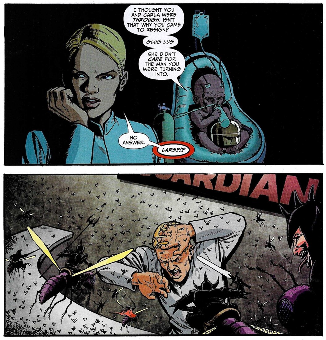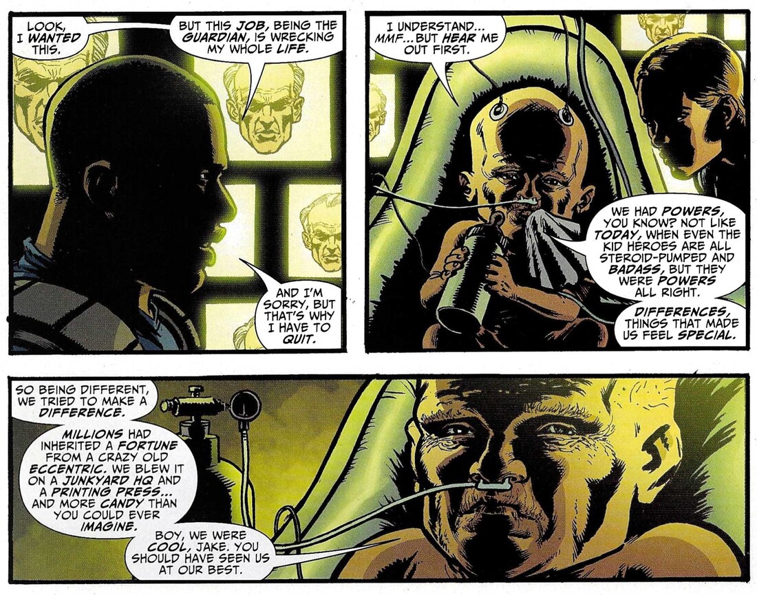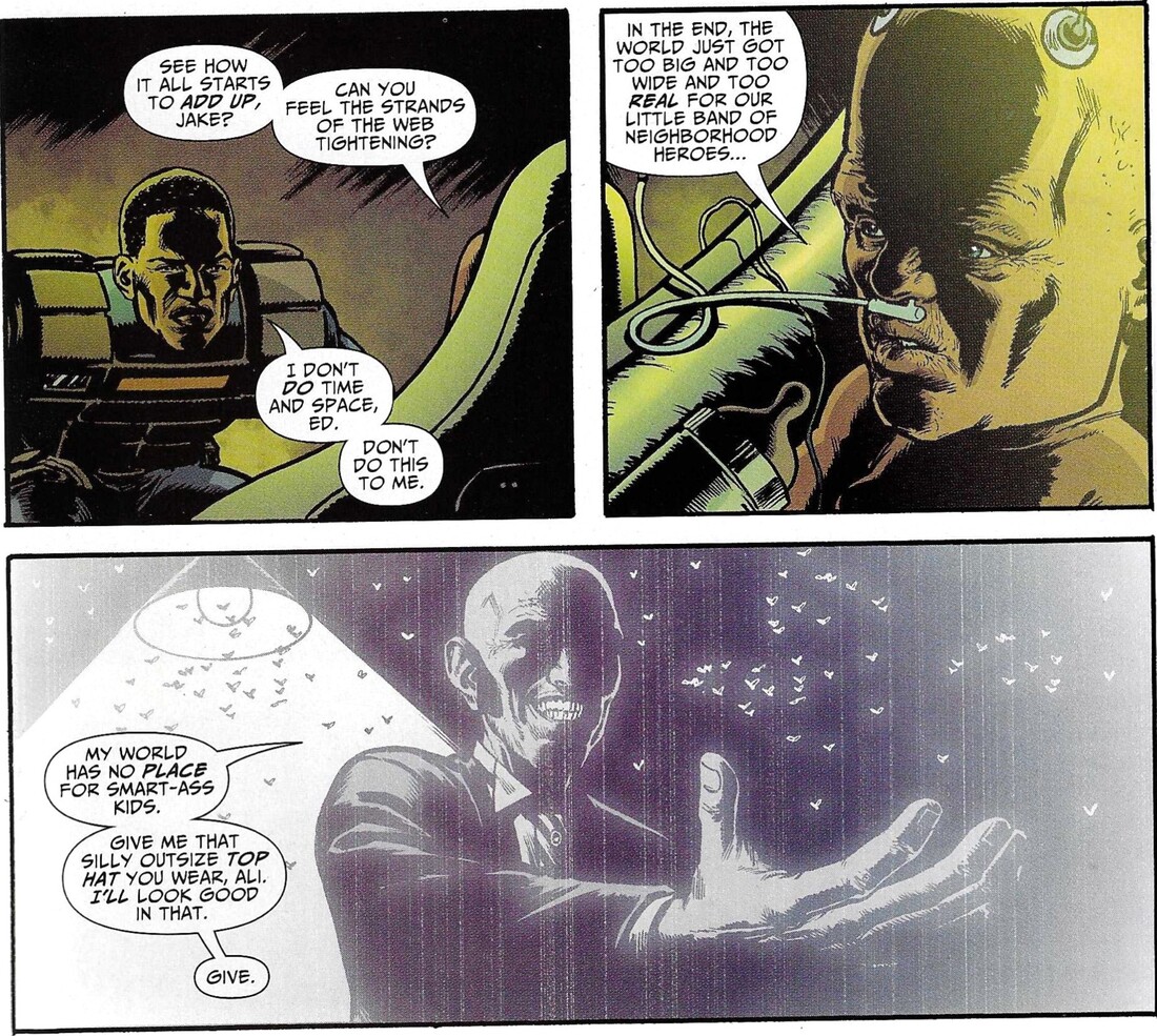 Weâre back in the present, and Jake is still trying to figure out whatâs going on. Ed tells him that he has the biggest story of them all — the editor of the Guardian is a big baby man, but Jake doesnât care about that. He just wants to know whatâs up. Ed tells him that if he had grown up normally, he wouldnât have a chance to save the world. Jake says he has to quit because the job is wrecking his life. Here we see the dilemma that runs throughout the series — Jake has his self-respect back, but heâs losing his girl. Which is more important to him? Ed asks to be heard, and he tells him that the Army was different, so they tried to make a difference. Millions had inherited money from a âcrazy old eccentric,â so they built a junkyard HQ and a printing press and blew the rest on candy. Of course they would! We go into flashback again, and the Army stands in front of the United Nations building and swears to make things better. They say, âAnd nothing will ever divide us,â another one of those ironic statements Morrison loves writing, considering whatâs coming up. Notice there are seven members, so they have a good shot at winning. Later, they leave Millions at home, and things go FUBAR. Back in the present, Jake coldly tells Ed that it will take more than sympathy to keep him around. Ed says their old enemies are coming back, in âflying murder factories as big as cities,â which is a fine description of places like Castle Revolving.