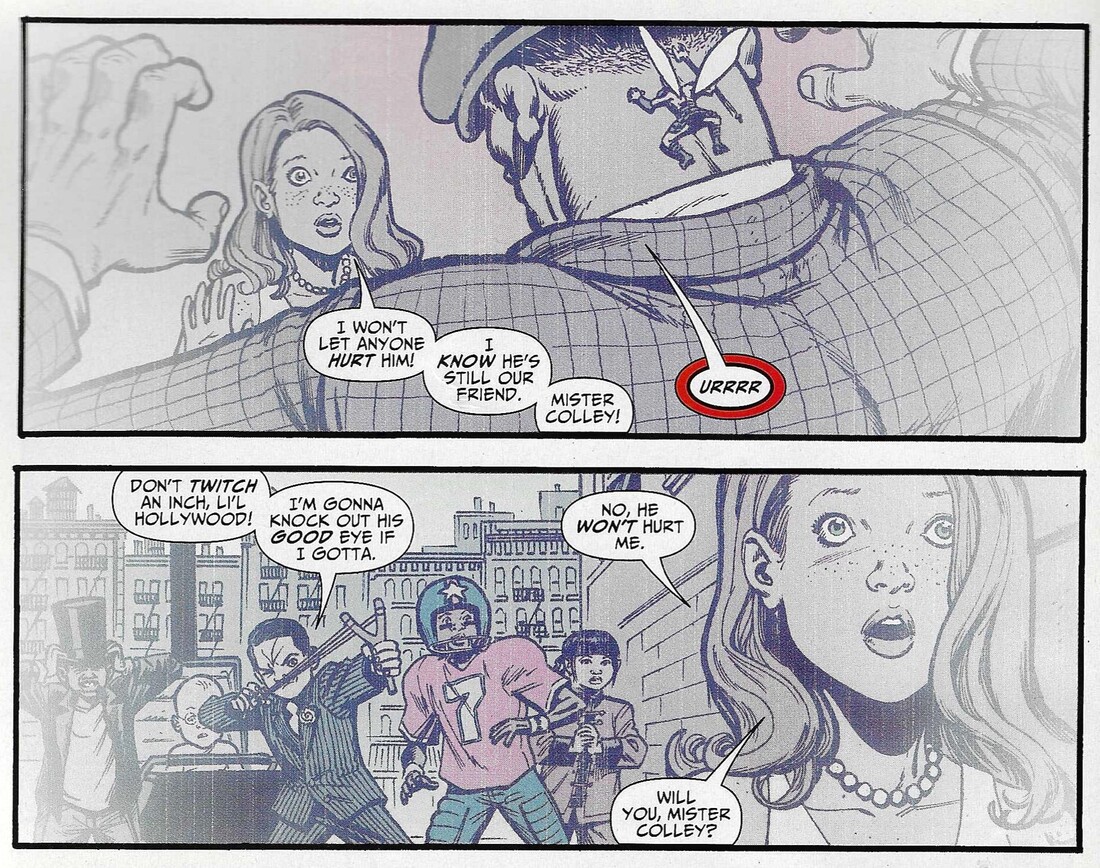 We go back into flashback, and Ali Ka-Zoom shows up at the printing press, where the Army is publishing the Nowhere St. News with a headline about Mo Colley knocking out Ted Grant, otherwise known as Wildcat. Ali tells them that Mo himself is murdering cops in Nowhere Square. âEl Marâ called him and told him. This is Larry Marcus, Carlaâs father, who got Jake the job with Ed. I mentioned when I wrote about the first issue that Larry was a member of the Newsboy Army. It appears that he wasnât really, just friends with them. Maybe he was like Snapper Carr! The kids canât believe it (Moâs best friend was a police horse — possibly named Horsefeathers?), but they run to the rescue. Mo is in the square, pulling the eyes out of copsâ heads, twisting their necks, acting like a mindless Grundy, and speaking in the Sheeda language. Lâil Hollywood tries to talk him down, and we see the Sheeda clinging to the back of his neck. Mo looks like heâs had a stroke, if you notice. Hollywood manages to get through to him, and Mo rips the Sheeda off the back of his neck and tells Lâil Hollywood, âI gone and ruined my big comeback.â The cops immediately gun him down, leaving Lâil Hollywood spattered with blood and holding a dead Sheeda. It ends up in a jar, which eventually finds its way to Cassandra Craftâs store and we see it in Zatanna #2. Baby Brain lets us know that it takes control of the central nervous system via the brainstem and could be the reason for human legends — that word again — of changelings. Baby Brain mentions that between Gotham City and New York is Slaughter Swamp, where there was a report about a man being harassed by âtiny medieval fellers riding bugs.â Baby Brain, for some reason, suggests they split into two teams. Why, exactly? Lâil Hollywood is upset that Millions has to stay behind, but Kid Scarface points out heâs getting too old for adventure. Baby Brain, as smart as he is, doesnât understand what happens to groups of six, which is what theyâll be if they leave Millions behind. Both Suzi and Cap 7 are ambivalent about going to Slaughter Swamp. Suzi says she told her parents sheâd help out at the laundry — another stereotype! — while Cap has to go to college. Baby Brain points out that itâs for Mr. Colley, and Kid Scarface says, âItâs two fuckinâ teams all right!â The annotations say that Millions is Team One, while the rest are Team Two.