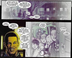 This is a very good issue just for the story and art, as Stewart does a nice job with the flashbacks, giving everything a patina of nostalgia. The old scenes look like a newsreel, and their grainy quality is charming when the story remains light and creepy when the Newsboy Army ventures into Slaughter Swamp. Stewart, as usual, does a fine job with the present-day scenes, giving Edâs nerve center an ultra-modern look as well as a heavier line. Itâs a nice contrast.
