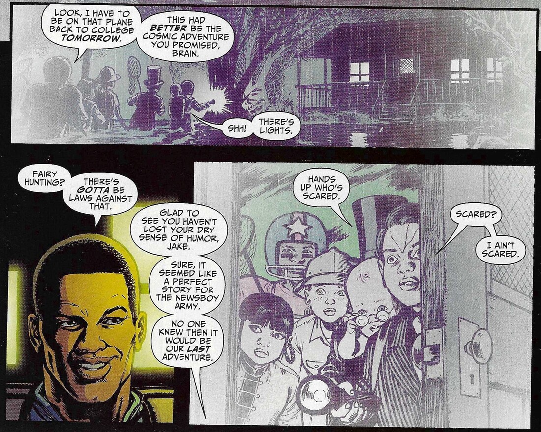 Vincenzo shelters Vanguard and fights the Sheeda to the death. Ali guides Justine and refuses to die until he gives comfort to Vincenzoâs soul. Years after their dissolution because they âgrew up,â the Newsboy Army has grown up for real. Morrison does indicate that there is a loss of something wonderful when we reach adulthood, but it is possible to still remember what it was like to be a child and incorporate that into your new personality. Jake had forgotten that, but this issue (and the mini-series up to this point) reminded him of it. We canât stop puberty and the onset of adulthood. But we donât have to become soulless in the process. We can still do the right thing regardless of âthe job or the money.â We can still be children at heart, even though we have to make harder choices and face more dire consequences.
