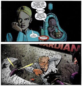 The grand theme of this issue is, of course, growing up. The saga has concerned itself with becoming a hero as a metaphor for growing up, but in this issue, we see the both the darker side and the brighter side of growing up. In the issue âpriorâ to this, we see Justine go through a transformation that, as Ragnell argues, marks her journey from girl to woman. In this issue, Morrison returns to this idea that adulthood somehow marks the loss of heroism, as the kids grow up and lose their youthful exuberance and innocence, highlighted, of course, by the sexual relationship between Suzi and Cap. The Time Tailor, like Melmoth, makes repeated references to growing up, and makes it sound horrific. Adults, after all, have secrets, and itâs this that binds them to places like Slaughter Swamp. When Ed was a child, he roamed the streets freely, fighting injustice. Now that he is an adult, he hides himself away, because heâs ashamed. The Newsboy Army are not, in the final analysis, true heroes, because of the fact that they donât grow up properly. In the present, after years of wandering in the wilderness, is when they become true heroes. Ed makes sure that the âSeven Soldiersâ concept might work this time.