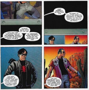 Itâs a good issue, as it gives us a lot of information that we need to know about the greater saga. Itâs nice to see Helligan again, even though this is her swan song, and although we donât know yet who Sara is, her introduction shows us that bad things are on the horizon for Alix Harrower. Interestingly enough, because of the plot-heavy elements of the issue, thereâs not really a lot to look at in terms of grand themes. Alix stands around listening to other people talk — she doesnât really grow in terms of what it means to be a hero, and the oversexualized undercurrent of the first issue is only brought up when Alix visits the prison, and even then itâs far more subtle than in issue #1. We do get a few references to the nature of superheroes and how âdo-it-yourselfâ heroes are in over their head, something that Alix quickly agrees with when she hears Ramonâs tale of Neh-buh-loh and then when she witnesses a werewolf trying to get married. We go back to Seven Soldiers #0, where the âheroesâ were desperate to be heroic and paid the price for their folly. Alix is the same kind of hero, but she has a much more level head on her shoulders. Thatâs why she resisted going to Arizona in the first place.