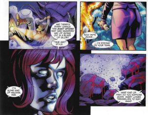 If anyone has any thoughts about it, feel free to chime in. Meanwhile, letâs move on, because Helen âSky-Highâ Helligan is making another appearance in the saga! The first page of issue #2 shows us a slide of Lucas Ludlow Dalt, alias the Spider, crucified to a wall, with arrows through his hands and one through his heart. Gee, not too much Christ-like imagery! Someone is saying that the chief suspect in the murder is Tom Dalt, who is desperate to prove himself to his family — another example of someone with low self-esteem. Tom disappeared the day of his brotherâs murder and appeared, âseven days later,â in Arizona. We see that the voice belongs to Helen Helligan, last seen in Shining Knight #3, when she seemed ⊠less together than she does now, thanks to a bite from the Queen of Terror. Alix is in the room, as well as three men. Helligan shows the next slide, which is Jackie Pemberton, whose âbag of trixâ was found scattered across the desert near Pepper City, Arizona. She shows Shelly Gaynor, a columnist for the New York Daily Recorder, who went missing. She shows Harris D. Ledbetter, or Dyno-Mite Dan, who bought two hero rings off the Internet. They were âworking fakes,â and we know he got them from Cassandra Craft, even though Helligan does not. Alix asks what this has to do with her, and Helligan shows her the ad that Greg Saunders placed in the trade magazine asking for superheroes. Alix suddenly realizes that this is the âseven soldiers thing,â and we learn that she was the seventh soldier — she had even bought a plane ticket. At the last moment, she realized that she didnât want to see people who were just like her — unlike the âoriginalâ soldiers, Alix is completely uncomfortable with being a superhero. Helligan tells her that sheâs lucky she missed out on what happened, and they roll the footage they got from the bikes — they were equipped with cameras, remember? Helligan mentions that Greg Saunders was dying of some unnamed illness, and thatâs why he wanted to get the spider at last. We see the same scenes we saw in Seven Soldiers #0, and we watch as Neh-buh-loh skewers Greg and Shelly at the same time (yet another version of Neh-buh-loh by a different artist, as Paquette draws him with what looks like more body armor — heâs not as starry). We also see a spider tearing Tom Daltâs intestines out, which makes the fact that heâs alive (as we know from Shining Knight) rather intriguing.