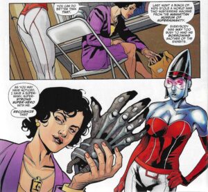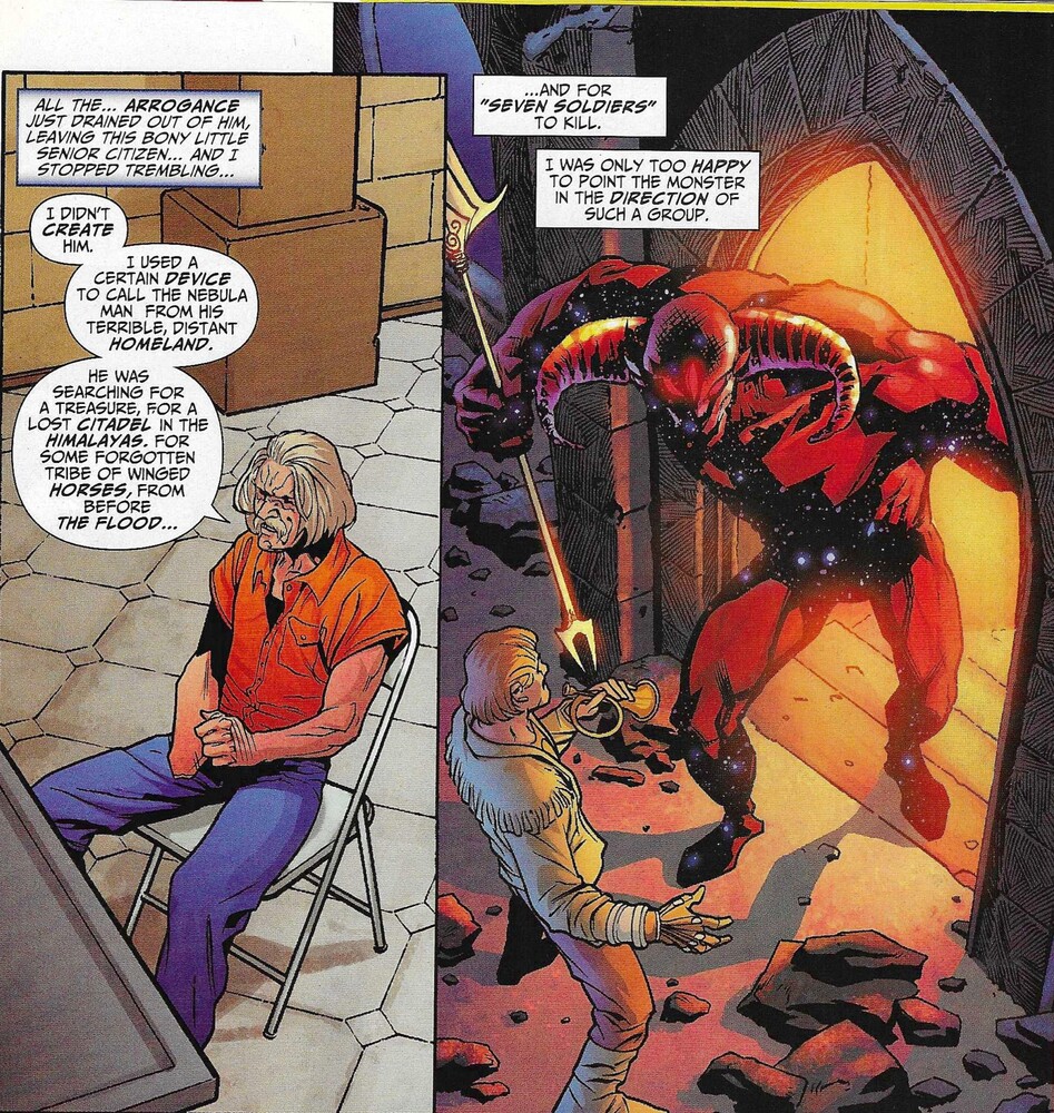 Helligan and Alix drive to the penitentiary, and Helligan tells Alix to keep away from the girls on the superhero porn sites, because theyâre kind of nasty. Alix, of course, will ignore her advice, although she wonât know it until itâs too late. Helligan coughs for the second time in the issue, and when Alix asks her if sheâs okay, she says sheâs reacting to the antibiotics and tetanus shots they gave her after Gloriana Tenebrae bit her. She also brings up her sister again, whoâs getting married in two hours, and we learn a bit more about the groom — he beats her up. So Helligan is trying to stop the wedding. She tells Alix that she shouldnât get involved in superheroes, because âthe only way in here is in over your head.â Inside the penitentiary, we see again that Morrison is playing with the conventions of female superhero sexiness. Alix is uncomfortable wearing her slinky costume in a male prison, but Helligan asks her to trust her — she knows a thing or two about supervillains, and believes Alixâs presence will help. Itâs interesting that Alix never had a problem showing off her body before, but now that sheâs coated with a metallic substance, sheâs suddenly shy. They get to their destination, where Ramon Solomano — Ramon One-Hand — is waiting. Heâs known as âThe Hand,â âThe Iron Hand,â and the âNapoleon of Crime.â Wow. Helligan wants to talk about Greg Saunders and the Seven Soldiers. Ramon tells her that the doctors told him he had a month to live and he went a little crazy. Helligan reminds him about the original Seven Soldiers of Victory fighting his Nebula Man in the Himalayas 40 years ago. One died, and the others were lost in time for 30 years. She then tells him that the Nebula Man returned a week ago and killed a new bunch of Soldiers. She is referencing events that occurred in JLA #100-102, the first appearance of the Nebula Man. Ramon tells her he had nothing to do with it, but the Nebula Man can âride through dimensions of time the way you and I walk through a door,â so heâs glad Saunders is suffering. Helligan tells him that when Klarion and the Deviants stole the sapper drill from the Museum of Superhumanity, nobody noticed that Helligan âborrowedâ Ramonâs Iron Hand. Remember the prominence Morrison and Irving gave to the Iron Hand in the scene in the museum? Ah, the crafty Grant! She holds it up for Ramon to see, and Alix breaks the thumb off, just to piss him off. She breaks the pinky off before Ramon caves in and tells them about the Nebula Man.