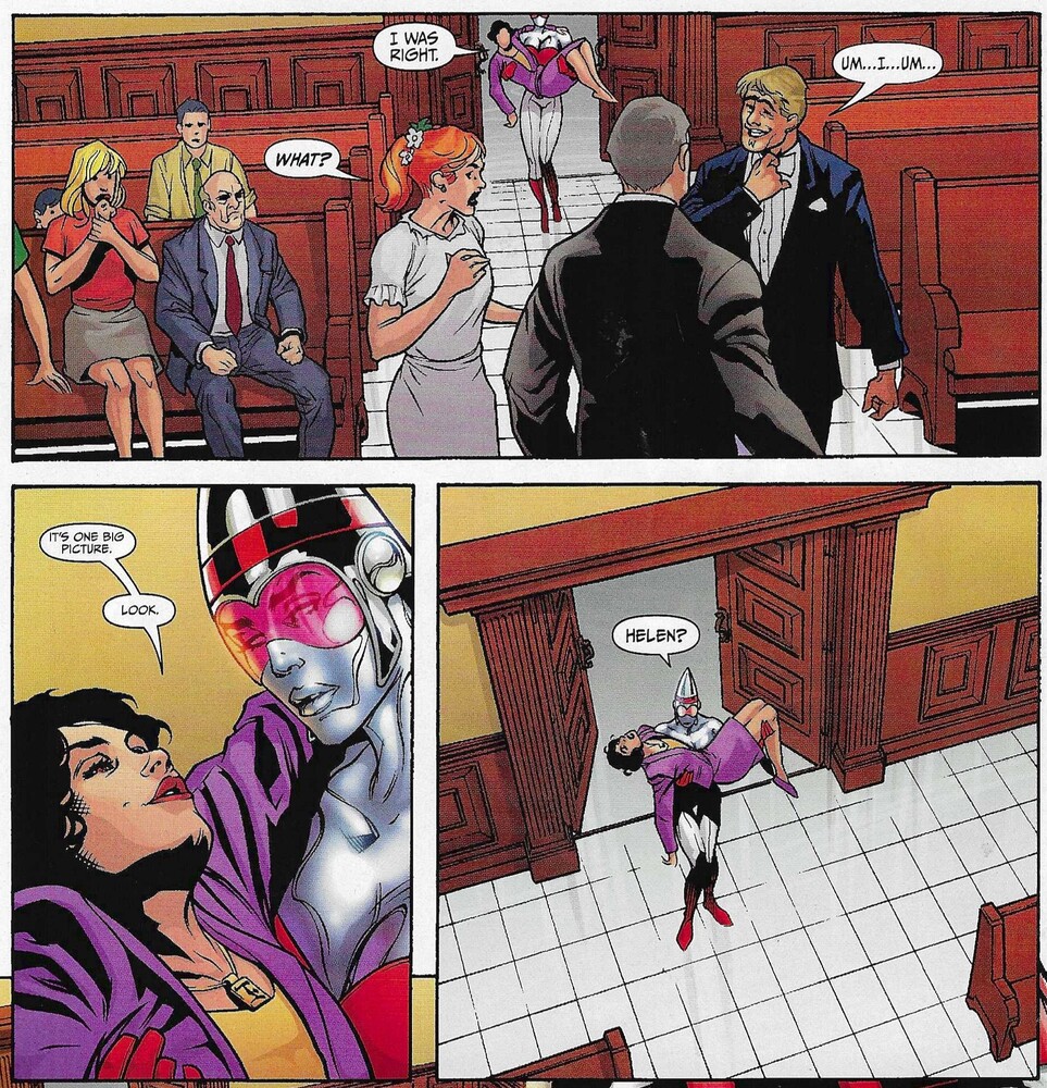 Brian, not surprisingly, doesnât remember anything about the milkshake. Helligan, youâll remember, always looks at the âbig picture,â and she makes an intuitive leap and realizes that âthe starry guy and the fairy folk are from the future.â As she begins to bleed, she asks Alix to get her to the church on time. Itâs nice to know that Helligan can make pop culture references even as she feels her life slipping away! We get a full-page shot of Alix carrying Helligan over the roofs of cars, and I was struck by the pizza parlor in the background. Its awning says â1=4″ with a picture of a pizza and the tag line, âWe bend the laws of physics with pizza.â I assume the pizza pie is supposed to represent pi (Ï), but I canât really figure out what the equation means. I just thought it was funny. They reach the courthouse just as Helliganâs sister, Rose, is about to say âI doâ to Lido Lupelino — not the same guy who was busted by the Vigilante, we have to assume, but maybe his son? Alix bursts in with Helligan, who manages to yell out âThe guyâs a werewolf!â before dying. Lido Lupelino looks somewhat sheepish, which I thought was a nice touch.