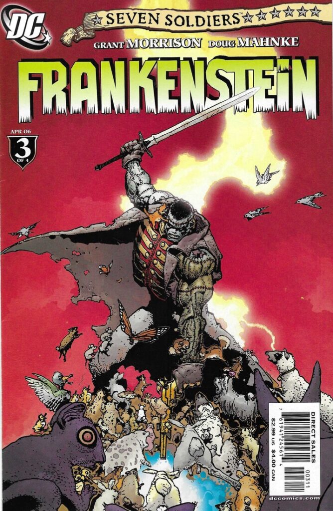 So thatâs the issue, and it remains an odd little sidebar to the main epic, even though we get a little bit of information. For me, the most intriguing thing in the issue is when Frankenstein actually tastes the water. âItâs only water,â he says. This is really not expanded upon, but it implies to me that the people of Salvation Valley went nuts for an entirely different reason, and the water is a convenient scapegoat. We see no Sheeda in this issue, but the way the creatures in Salvation Valley run amok reminds me of Mo Colley, killing cops in Nowhere Square. In Seven Soldiers #1, the Sheeda cause riots in the streets of New York. Why do the people in Salvation Valley go crazy? The other explanation is that Morrison is simply showing people giving into their deepest desires, thanks to the millennarian fever that is in the air. The whole saga has an apocalyptic feel to it (which every good superhero epic should have) and as this epic seems more in the public eye than say, Infinite Crisis, itâs possible that the people of Salvation Valley have simply freaked out on their own. That doesnât explain the animals, sure, but if Hitchcock didnât have to explain why The Birds went crazy, why should Morrison? The hints that the water is NOT responsible for the insanity is fascinating, but unfortunately goes nowhere. Too bad!