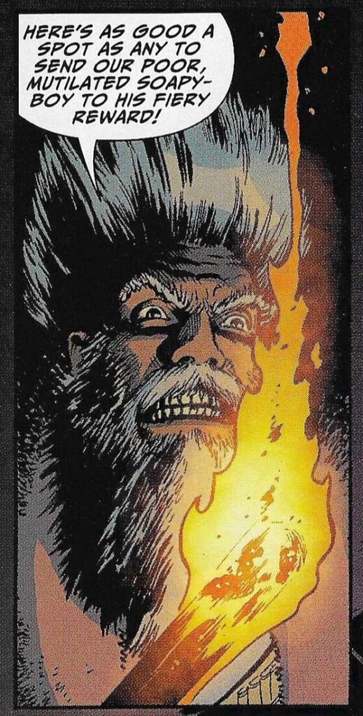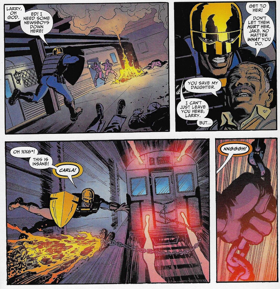 Morrison ties the Guardian thing into the Superman comics, where it showed up in the 1990s (and before, since he’s a Kirby creation from the 1970s, but I know it from the 1990s). [As was pointed out in the comments, the Guardian is actually from the 1940s. I suck!] Stargard bought the trademark from the Cadmus Project, which developed the technology. Jake gets his own car, which unfortunately breaks down. While he’s sitting in his car, he’s listening to the radio, which announces that Shilo Norman, Mister Miracle, will attempt to escape from an artificially generated black hole, which is where that series begins (behind him is a Pumpkin taxi, in which Klarion rides on his crazy trip through New York). It’s probably a coincidence (in a Morrison comic? never!) that our writer links the two series that have black men as their heroes. The idea of race is not brought up overtly in the series, but it’s something to consider, and I’ll give it a go at some point. Ed gets word that the pirates have shown up at 8th and Broadway, which is where Jake was supposed to meet Carla and Larry. We shift to the station, the same station where Soapy got his back ripped off, and now All-Beard the pirate has tied Soapy down and is about to set him on fire. Something tells me that Soapy should avoid that subway station. All-Beard is gripping Carla’s wrist while another pirate kicks Larry’s glasses out of his reach. But then the Guardian shows up, and Morrison does a nice job writing the narration like a pulp novel (or a Kirby comic): “Suddenly the sputtering barks of a dying engine cut through the chill-blooded, mocking laughter of more than a dozen sub-human killers!” You get the idea. As Jake is kicking ass, All-Beard sets fire to Soapy (who is chained to the subway train) and absconds with a hostage — Carla. Jake gets to Larry, who is dying, but who tells Jake to save Carla, no matter what. Jake manages to grab hold of the chain to which Soapy is tied, and the books ends with the train dragging both the Guardian and a blazing Soapy! Now that’s entertainment!