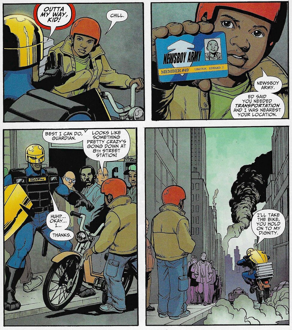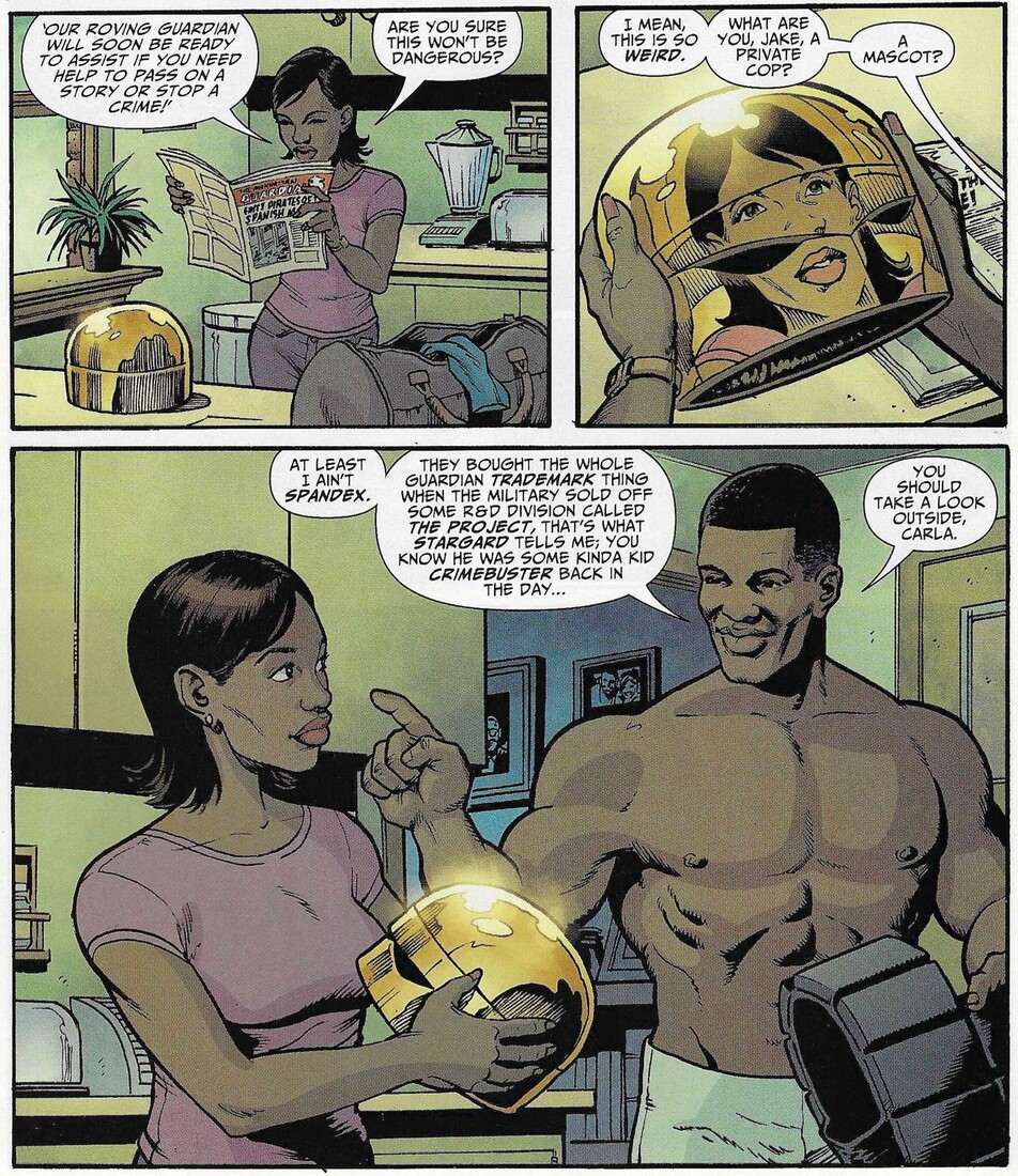 We shift scenes to a supermarket, where Jake Jordan and Carla Marcus, a couple, are arguing. In a car, Carla’s parents, Larry and Lauren, look on, and Larry mentions that Jake needs his self-respect back, and that the Guardian has a job ad that might work for him. He tells Jake that the newspaper is looking for ex-police and military men for a position. We don’t know yet that Larry and the newspaper’s publisher, Ed Stargard, were both members of the Newsboy Army back in the day, fighting crime and getting into trouble. Yes, it’s a set-up! When Jake goes in for his interview, he passes a man getting carted out on a stretcher muttering about a golem on the third floor. When he mentions that he’s there for the interview, he’s attacked by the two people at the front desk. Suddenly an image of Ed appears above the desk, telling Jake that the two are terrorists, there to kill him. Jake gets to the elevator, where Ed tells him that he made it to the 23rd floor, but they’re coming to get him. When Jake arrives, the golem on the third floor is now on the 23rd. Jake knows to wipe out the magic word on its forehead, though, and does so, rendering the golem inoperable. He beats up the remaining two terrorists, gets into Stargard’s office, and finds out the whole thing was part of his job interview. The golem is part of a super-team of golems Ed created when he was ten. He’s apparently somewhat precocious. Ed asks Jake about the boy he shot when he was a cop — a boy Jake believed had just shot his partner, but hadn’t. This is why he quit the force and why his relationship with Carla is messed up. Ed tells him he’s offering Jake a new chance, and that the newspaper needs its own superhero. Hey, it’s the Guardian helmet from Seven Soldiers #0! Who woulda thunk it?