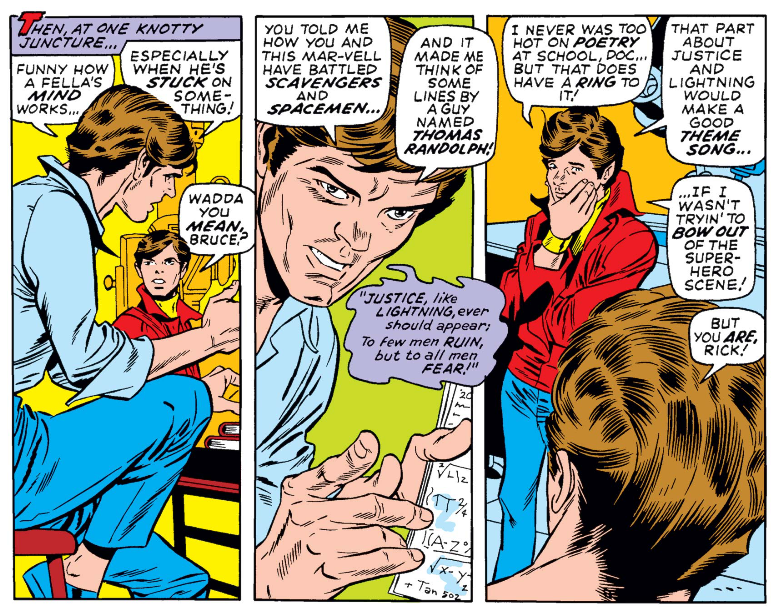 You heard that right. Bruce Banner (scripted by Roy Thomas) beats Black Lightning to “justice like lightning” by seven years, and the Thunderbolts by several decades.
