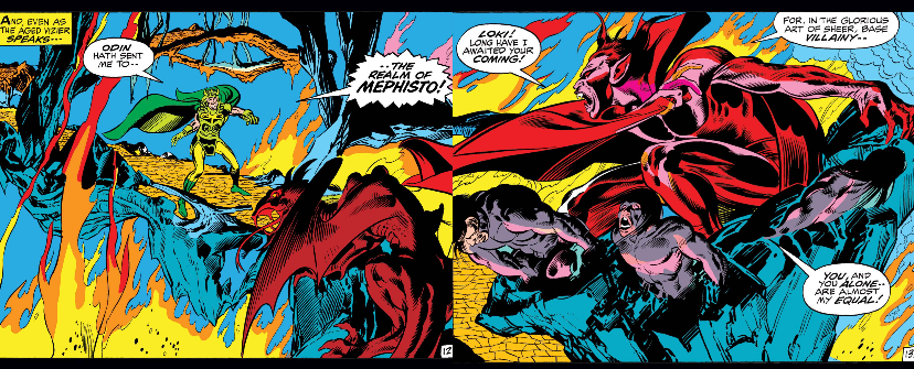 First, this Neal Adams shot [edited to get name right] from Thor #179. It’s not a great story: Loki swaps minds with Thor and Odin can’t help because he’s sealed away for (honest) Brooding Time. But I think this visual of Thor-as-Loki getting trapped in Mephisto’s realm is pretty cool.