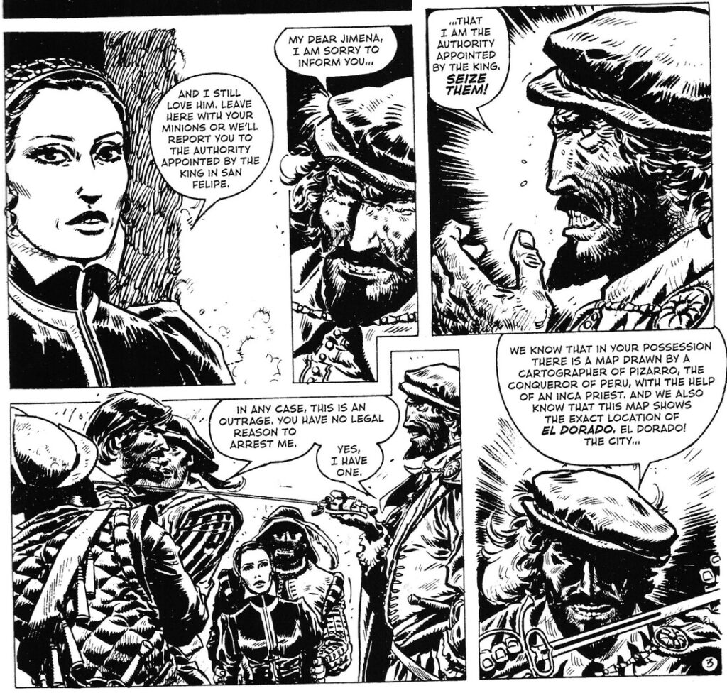 Trillo doesn’t deviate from this formula too much, but he does do a lot within it. His women aren’t always ornamental or byproducts of the main action, but, like Tihuo, they’re often an afterthought. When he does want Alvar to interact with a woman on a more serious basis, he does it, but they’re often incidental to the story. Trillo doesn’t seem to trust groups — whether Spanish or native, whenever Alvar encounters a tribe or group, they tend to be antagonistic toward him and his allies. He joins small groups from time to time, and very rarely does it work out well, and if it does, it’s usually the smaller the group, the better. The strips stand on their own, but Trillo does work in some longer arcs — toward the end of the first volume, Alvar gets together with Lucía, who is about to be hanged because the townspeople think she’s a witch. Alvar does what he can to rescue her, but like in a lot of the stories, Trillo doesn’t make him the hero — he acts heroically, but outside forces eventually free him and Lucía. They spend some time searching for treasure, and eventually, they team up with Don Gonzalo Pedrera, who also is looking for treasure.