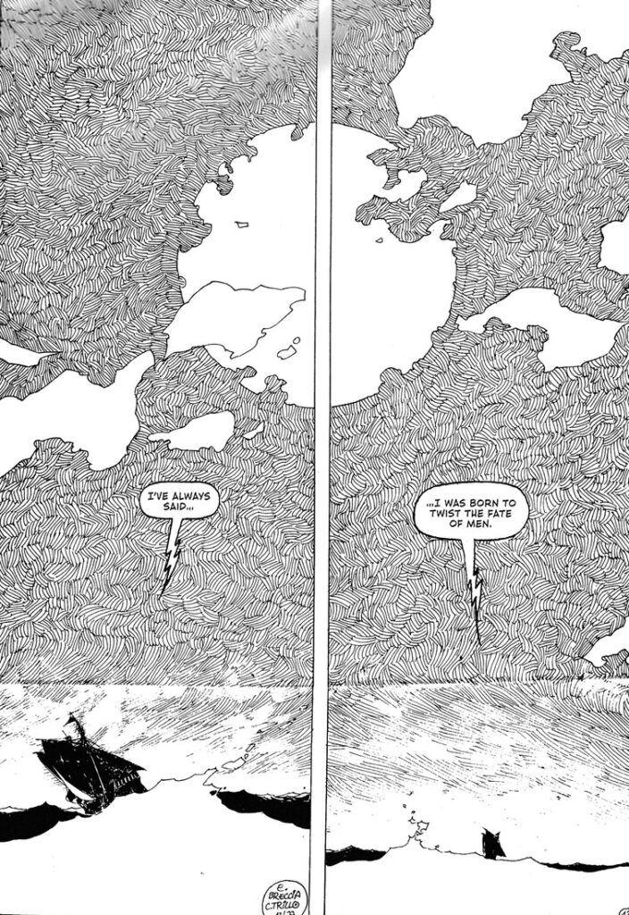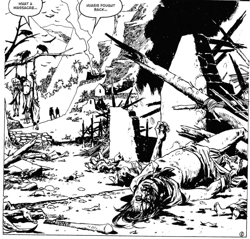 Trillo and Breccia took a good adventure idea and turned it into something darker, more thoughtful, and more compelling without ever losing the adventurous parts. The book has dastardly villains, beautiful damsels in and not in distress, weird humor, some stock characters that Trillo deepens through the writing, and stunning art that brings this distant yet familiar world to life. Despite the setting and time period, Trillo never loses sight of universal human traits — lust for money, yes, but also a yearning for meaning in a world that seems determined to wrest understanding away from us. Alvar never finds a home and only finds love briefly, but he is content with his life, as he knows that what he does — search — has endless possibilities and endless victories, while those he guides, who are looking only for treasure, never figure out how to be happy. The strip ends with Alvar learning some things about his father and his time spent with Pizarro, and Trillo shows that even though his father was a decent man, Alvar has surpassed him, as he is able to resist the lure of gold. Trillo gives us a noble man among many who are not, and takes what would have been a good adventure story and turns it into a psychological masterpiece.