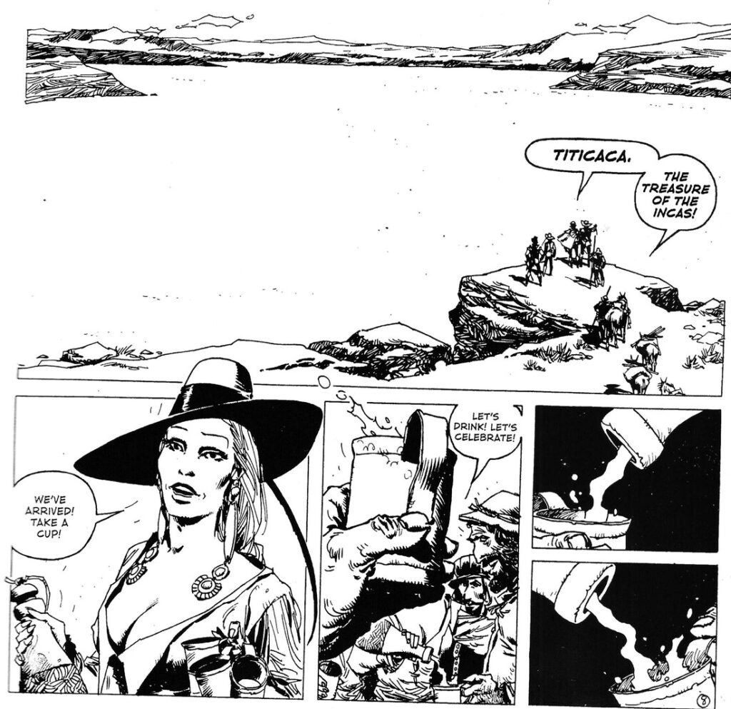 There are several examples: when Alvar guides the group to Lake Titicaca, the woman betrays her husband to canoodle a much more handsome man on the expedition, and everyone pays the price for their avarice. Alvar visits an old flame who refuses to see him, and another man, who has lusted after her, kills her father and claims her, which turns out very poorly for him. Two men fighting in a battle argue over one woman, and they both act rashly and dangerously to gain her love … but neither do. Two old men ask Alvar to help them search for the water of immortality, but, of course, they fight each other over it and kill each other. Alvar and Lucía find an old man in the jungle, defending a native temple with the members of his expedition, who are all dead (but whom he propped up to appear as if they’re alive) — he’s gone insane over the years, obviously, and he only wants help uncovering the treasure, which turns out to be worthless. When Lucía leaves Alvar, it’s because she doesn’t believe he can make her rich, and her desire for gold is greater than her love for Alvar. Alvar believes that the search is what’s worth it, while Lucía — and many others in the strip — believe the treasure is the real prize. Trillo is kinder to Lucía than he is to most of the characters, partly because she’s a woman and partly because she does not betray Alvar, simply tells him what she wants.