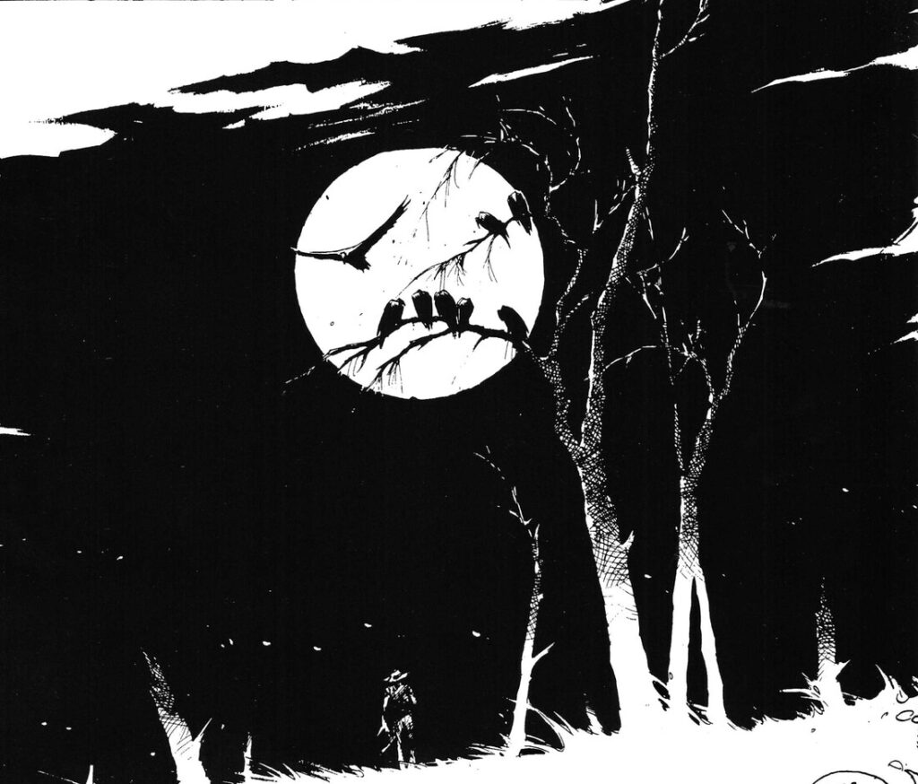 He does some interesting things with page designs, as well — most notably when Alvar imprisons a man for his own safety — someone is coming to kill him — and Breccia tells the entire story in thin, vertical panels, mimicking the bars of a cage. Breccia shows some violence, but not too much — very often any killing takes place just off-panel, as he shifts the point of view to, say, a close-up of the hand holding the knife or sword rather than showing the blade pierce skin. There are a few interesting exceptions to this — in one story, “Angela,” he uses six thin panels on one level of the page to show a head getting separated from a body and spinning to the ground, and there’s a very good reason that Breccia lingers on it so much. In another story, “The Hero of Villa Rica,” a man kills his enemy, and while we only see the blade of his sword on the downstroke from the killing blow, Breccia uses five panels across two pages showing the victim collapsing, dead, as it’s such an important event in the mind of the killer, and he savors it for as long as he can. There is certainly violence in the book, and Breccia does show people fighting and the grim aftereffects of violence, but it’s not a particularly bloody book. Trillo and Breccia do a better job showing how violence eats away at people rather than showing the violence itself, and it fits nicely into the tone of the book.