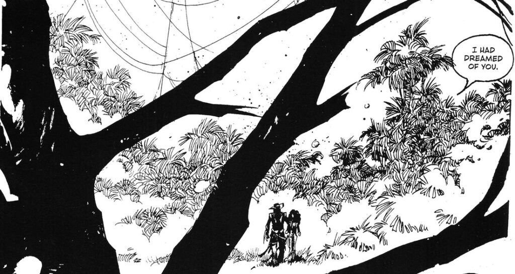 As Trillo changes the tone of the stories, Breccia changes his artwork. Beginning with the sixth story, “The Water of Dreams” (in which Alvar has to rescue the daughter of an old man from the lord of darkness, with the help of a goddess who appears in the form of a cougar), Breccia begins to loosen up his linework and use more negative space.