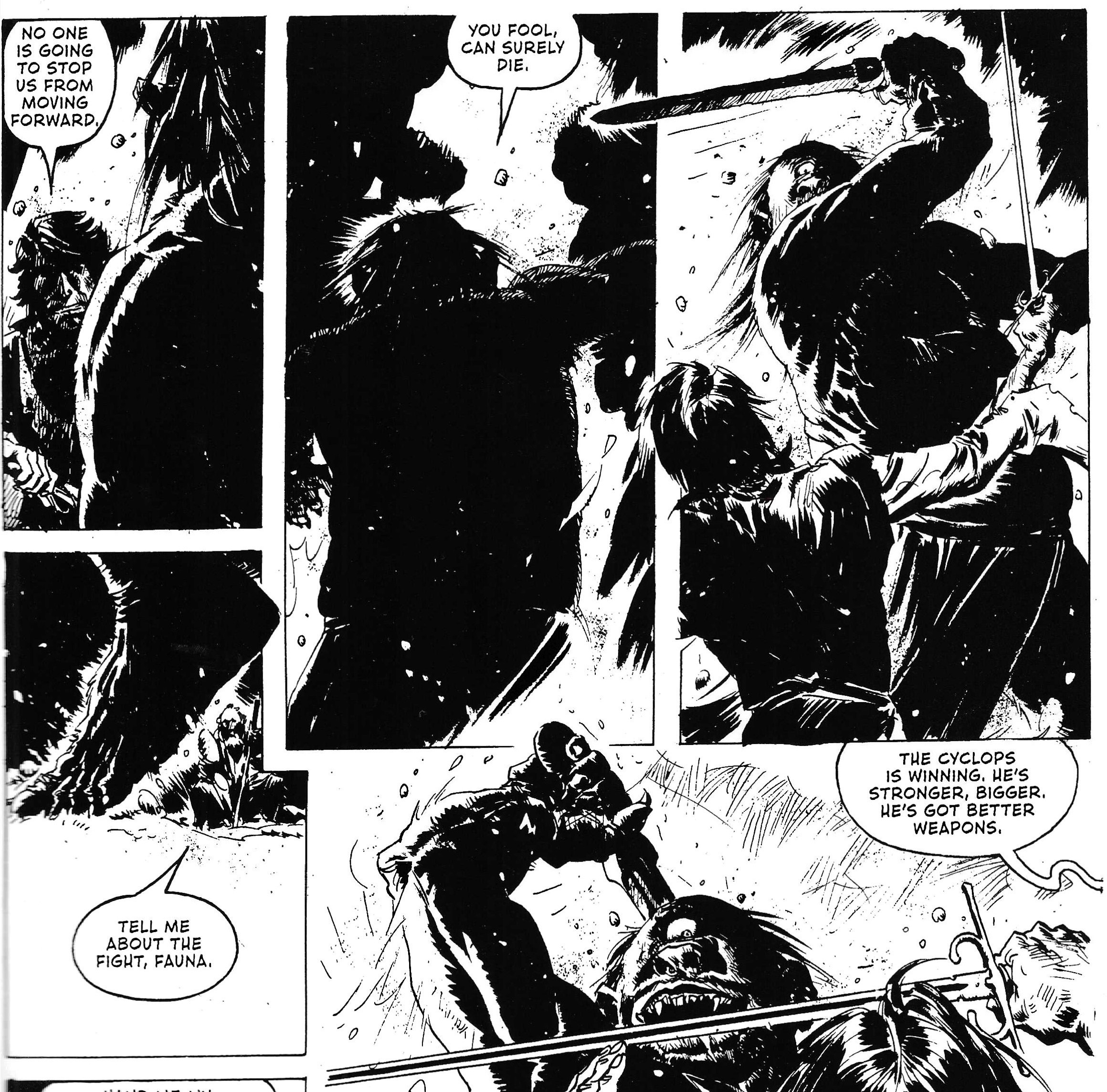 The stories, as I noted, fall into similar themes: people are searching for things, and they hire Alvar to guide them. But early on, Trillo begins to introduce elements of magical realism into the stories, and Alvar Mayor becomes a much more phantasmagorical book than you might expect. As the series begins, we get: the story I noted above, about the haughty nobleman who meets his fate in the jungle; a story about Spaniards enslaving Indians and Alvar and Tihuo’s fight to free them; a man who believes that in Macchu Picchu is the key to immortality but discovers that he’s sorely mistaken; and a story in which Alvar and Tihuo guide two competing groups to Lake Titicaca in a race to see who can reach it first (it is in this story that Alvar bets his magnificent hat and loses to Tihuo, but in the very next story, he has it back, which is indicative of Trillo’s regard for “continuity”). Those are the first four stories, and they’re fairly straightforward. Then, in the fifth story, Alvar meets an older version of himself, who tells him a prophecy about upcoming events which come true perfectly, much to Alvar’s chagrin. After that, Trillo starts to get a bit weird. Alvar fights different gods and spirits; Alvar dreams of Lucía before he ever meets her; Alvar faces off against a Yeti; a troupe of actors that join his adventure with Lucía and Don Gonzalo can predict the future; Alvar meets Homer and fights Polyphemus the Cyclops; Alvar frees cursed lovers who have been transformed into flowers; Alvar has to fight three reflections of himself at different stages in his life that emerge from magic mirrors;