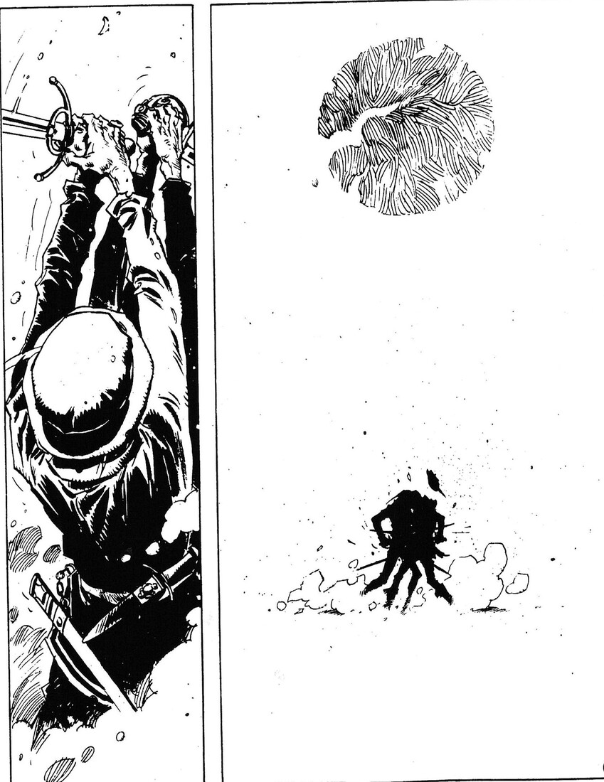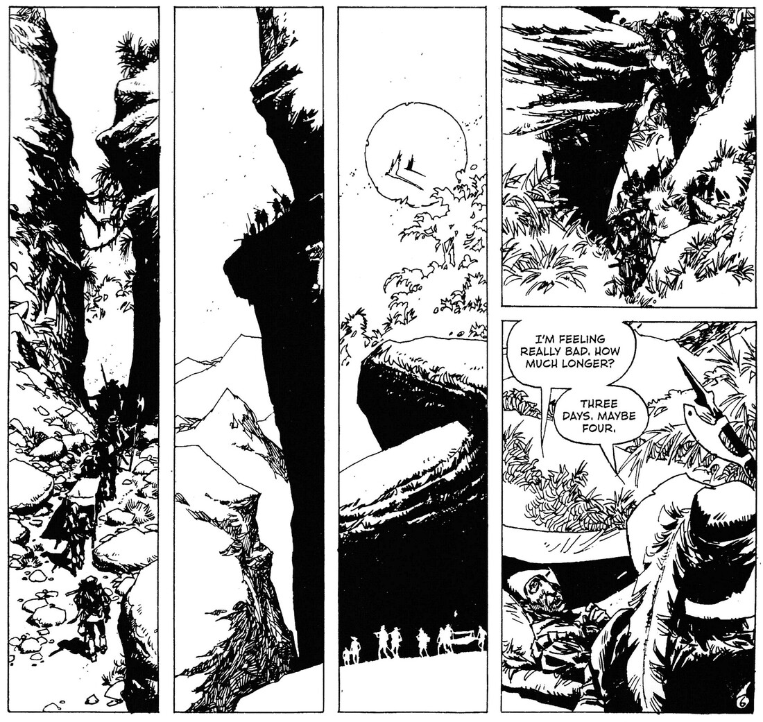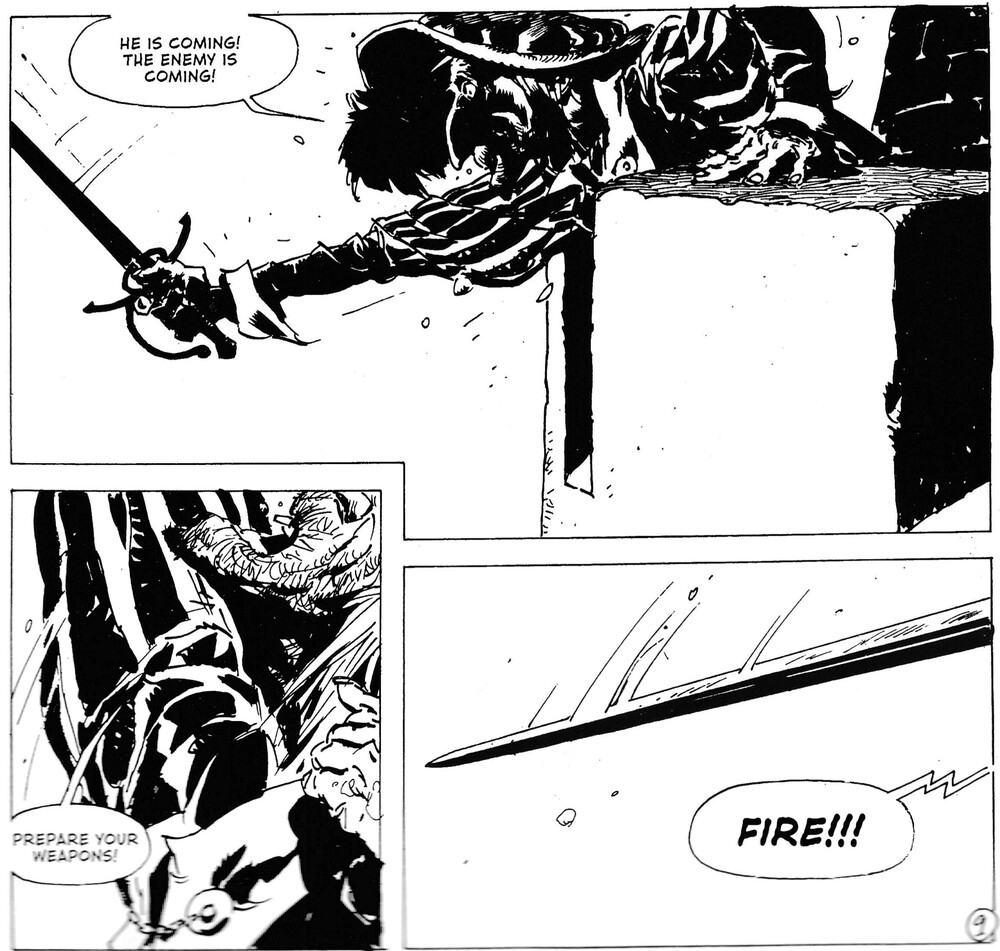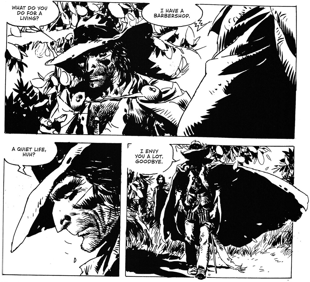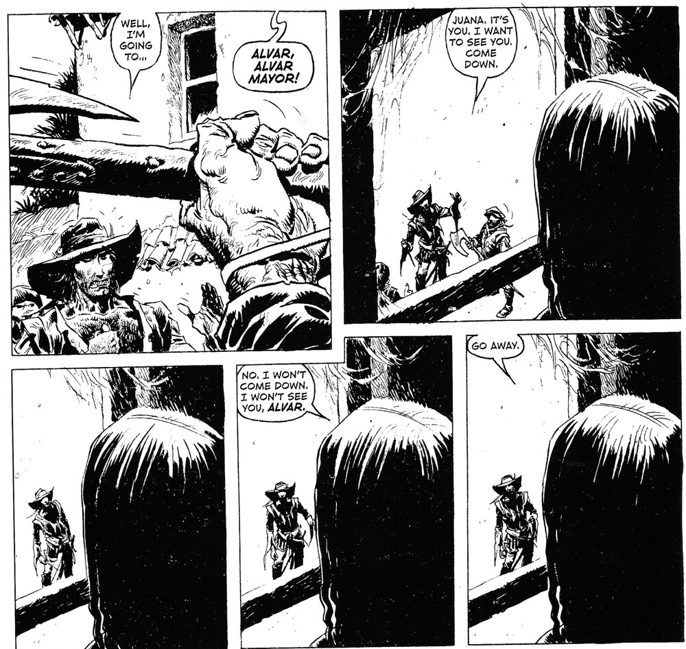 He does some interesting things with page designs, as well — most notably when Alvar imprisons a man for his own safety — someone is coming to kill him — and Breccia tells the entire story in thin, vertical panels, mimicking the bars of a cage. Breccia shows some violence, but not too much — very often any killing takes place just off-panel, as he shifts the point of view to, say, a close-up of the hand holding the knife or sword rather than showing the blade pierce skin. There are a few interesting exceptions to this — in one story, “Angela,” he uses six thin panels on one level of the page to show a head getting separated from a body and spinning to the ground, and there’s a very good reason that Breccia lingers on it so much. In another story, “The Hero of Villa Rica,” a man kills his enemy, and while we only see the blade of his sword on the downstroke from the killing blow, Breccia uses five panels across two pages showing the victim collapsing, dead, as it’s such an important event in the mind of the killer, and he savors it for as long as he can. There is certainly violence in the book, and Breccia does show people fighting and the grim aftereffects of violence, but it’s not a particularly bloody book. Trillo and Breccia do a better job showing how violence eats away at people rather than showing the violence itself, and it fits nicely into the tone of the book.