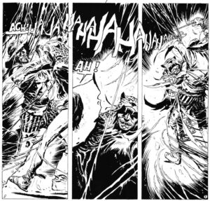 As Trillo changes the tone of the stories, Breccia changes his artwork. Beginning with the sixth story, “The Water of Dreams” (in which Alvar has to rescue the daughter of an old man from the lord of darkness, with the help of a goddess who appears in the form of a cougar), Breccia begins to loosen up his linework and use more negative space.