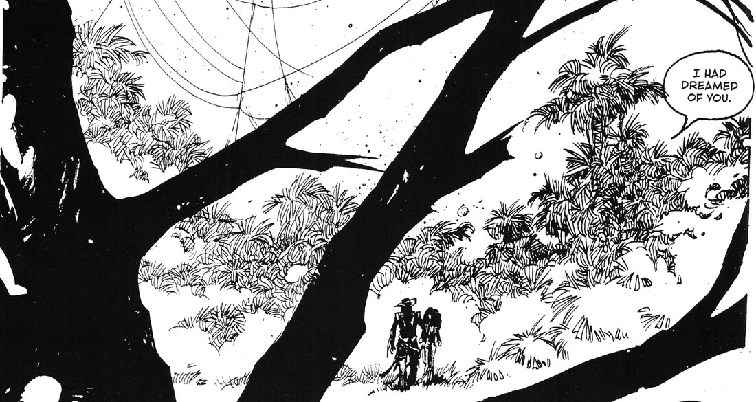 Trillo and Breccia took a good adventure idea and turned it into something darker, more thoughtful, and more compelling without ever losing the adventurous parts. The book has dastardly villains, beautiful damsels in and not in distress, weird humor, some stock characters that Trillo deepens through the writing, and stunning art that brings this distant yet familiar world to life. Despite the setting and time period, Trillo never loses sight of universal human traits — lust for money, yes, but also a yearning for meaning in a world that seems determined to wrest understanding away from us. Alvar never finds a home and only finds love briefly, but he is content with his life, as he knows that what he does — search — has endless possibilities and endless victories, while those he guides, who are looking only for treasure, never figure out how to be happy. The strip ends with Alvar learning some things about his father and his time spent with Pizarro, and Trillo shows that even though his father was a decent man, Alvar has surpassed him, as he is able to resist the lure of gold. Trillo gives us a noble man among many who are not, and takes what would have been a good adventure story and turns it into a psychological masterpiece.