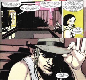 One other aspect of Albuquerque’s art that fascinates is its evolution over the course of the series. It took over 11 years to finish the series, and Albuquerque’s style shifted as the years went on. Early on, he draws in two slightly different styles, as the first trade is split between the “present day” of 1925 and Skinner Sweet’s “origin,” “Bad Blood” (written by Stephen King), set in 1880.