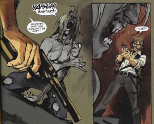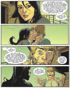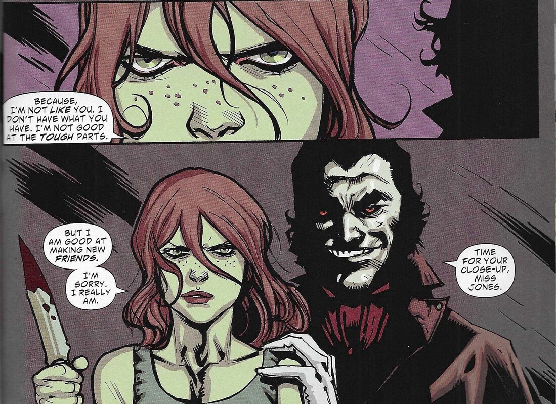 He does this a lot, with clever ways to show the vampires “turning,” and it makes the book tenser than it would have been otherwise. Albuquerque is excellent at action scenes, so the fights in this book are expertly done, and it’s nice to see how the characters become monsters so quickly, as Albuquerque does such a good job with that aspect of the art. He contrasts Pearl and Skinner Sweet well, too, as Skinner was not a terribly nice person even when he wasn’t a vampire, so when he’s vampire, he looks far more evil in his “human” aspect than Pearl does.