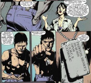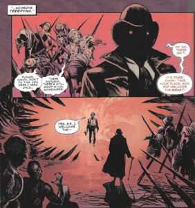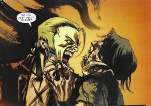 Snyder extends the theme to the other characters, as well. Jim Book, the Pinkerton who hunts down Skinner (in an added twist, they were childhood friends), is a prototypical “Old West lawman,” in that he’s a decent, somewhat conservative fellow who has a fairly rigid definition of right and wrong. At some point before he’s captured, Skinner kills Book’s fiancée, and that casts a shadow over Book’s life. His deputy is Hispanic, which feels somewhat progressive in 1880, and he’s godfather to his deputy’s daughter, Abilena … which doesn’t preclude him from having sex with her years later and fathering a child with her. Book also becomes an “American” vampire when he fights Skinner and gets some of Skinner’s blood in him, and his and Abilena’s child, Felicia, has some unusual abilities due to her father’s vampiric blood. Abilena kills Book rather than let him turn, but years later, she brings him back to life, and while it seems like he’s fine (or as “fine” as you can be with blood of a vampire in you), eventually he betrays humanity, and it feels like Snyder is making a point about conservatism curdling into hatred for anything different. Book makes a speech about the Great Evil that they’re all trying to stop, and how it’s basically anti-evolution, as it wants everything to regress to a primordial muck. Book, whose life did not turn out like he wanted it to, thinks this sounds good. It feels like Snyder is using Book to show how some conservatives, as they age, become even more rigid and resistant to change than they were in their youth, when they could have evolved. Book doesn’t want to evolve, and he’s willing to destroy humanity to return to an age of peaceful obeisance.