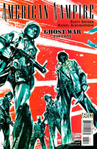 In the 1925 section, Albuquerque draws in his “regular” 2010 style — he uses thick, bold, slightly rough lines, and his drawing is just a bit angular in places, although that doesn’t stop him from drawing very good action scenes (Albuquerque was several years into his career when he began American Vampire, and this style was similar to what he had shown on his indie work for Boom! in the years just prior to this and on Blue Beetle, which is when most people started noticing him). McCaig’s colors are a bit flatter and more vibrant. In the 1880 section, he uses a thinner, slightly looser line — it’s still obviously Albuquerque, but it definitely has a “seen through the gauze of memory” vibe going on, and McCaig uses more rendering and not quite as bright colors to add to the effect. It’s an interesting contrast. By “Ghost War,” which begins in issue #13, his art has evolved a bit — his line work is a bit thinner, like it was in “Bad Blood,” but it’s not as loose as it was in that story. Albuquerque has gotten more confident, it seems, and when that happens with artists, they tend to go a bit more abstract, as they don’t feel the need to draw in every little detail. Albuquerque is still a very detailed artist, but you can see him becoming a bit more sketchy around the edges, as he doesn’t need to be as detailed as he was. He amalgamates a bit in “Death Race” (beginning in issue #22), as his lines are again thicker but his style is a bit looser. This style continues through the end of the first series in late 2012 and Long Road to Hell, which came out in the summer of 2013.
