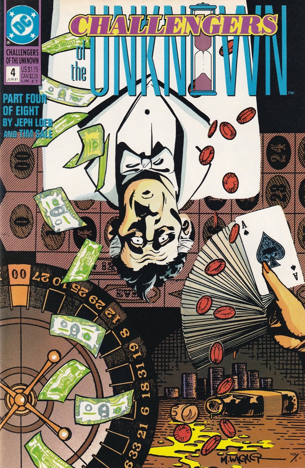 Jeph Loeb and Tim Sale. They have become celebrities in the comic book world for their collaborations, including three Batman Halloween specials, two long Batman murder mystery mini-series, a Superman mini-series, a Catwoman mini-series, and three mini-series for Marvel. Loeb is also the writer on Superman/Batman, which is often DC’s biggest-selling book [Edit: Obviously, I wrote this a while ago. I’m not in the mood to go over Loeb’s CV since Superman/Batman]. Loeb, especially, has polarized comics fans – obviously he has a lot of fans, but he also has a lot of detractors. I’m not the biggest Loeb fan, I must admit – The Long Halloween and Dark Victory are overrated as stories and as murder mysteries; Spider-Man: Blue, Daredevil: Yellow, and Hulk: Gray are self-indulgent fannish stories; and Catwoman: When In Rome was just plain bad. With this in mind, I recognize that he can write a good story. How do I know? I give you Challengers Of The Unknown, his first collaboration with Sale, and his first comics work, period.
