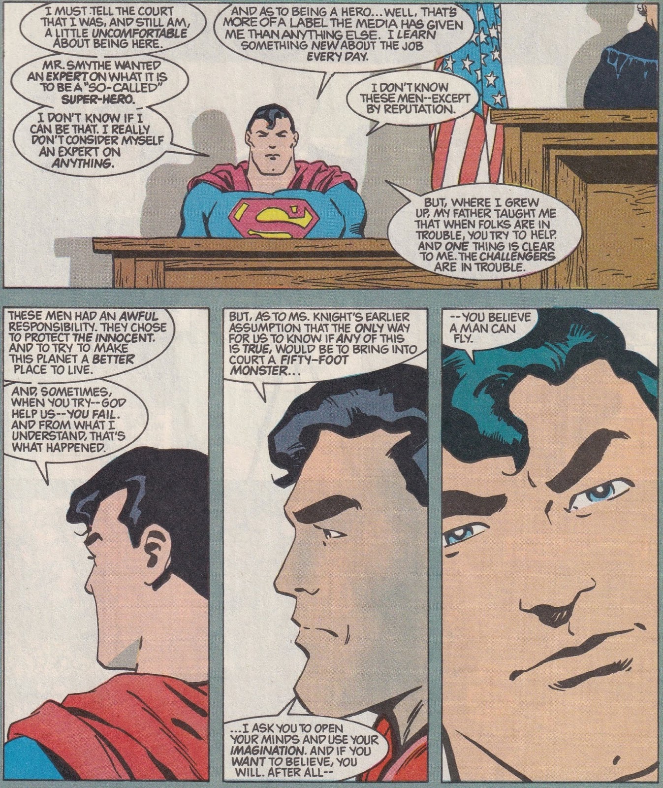 Can’t they just have adventures and be done with it? Well, of course they could, and yes, writers have turned the deconstruction of heroes into a cliché, but Loeb doesn’t deconstruct why they are heroes as much as he examines what makes them men. He doesn’t necessarily care why they do heroic things. He wants to understand why they don’t do evil things. Therefore, in the first issue, he shows them rescuing people who have been injured when the mountain explodes, but by the second issue, they’re on trial for murder. Loeb makes it perfectly clear that the Challengers are just people, not larger-than-life characters, and their exploits should be admired even more because of this. They’re acquitted, naturally, especially when Superman shows up as a character witness, but the team has been fractured and they go their separate ways. Loeb wants to ask, Were they heroes because they were in a team, or did they form a team because they were heroes?
