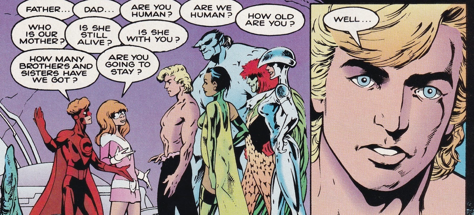 A family doesn’t have to be a biological unit, after all, and although the children know they’re all related, they don’t know that they’re all brothers and sisters. Adam is the prodigal father, and the interesting thing is that we never actually find out why he left Earth. We can infer that it has something to do with the fact that he was forced to kill his insane son, but that’s just speculation. The Destines are split over his return – some are happy to see him, and others, like Walter, resent the attention he gets from the children. He’s the exotic stranger, showing up with tales of Crusades and genies and magic, so of course they will gravitate toward him, especially because Walter is the one who makes the rules. Adam is not a good father, and the siblings, like Dominic, who should know better, make the same mistakes Adam made. The revelations about the existence of the family and their powers to the twins is a fine jumping-off point for a drama about how family binds us together whether we like it or not, and how we have to adjust every day to the subtleties of other people. In Davis’s final issue (of volume 1), when Adam, Walter, and Dominic go “crime-fighting” together, they bond in more ways than just sharing stories from the past – they bond with the absent children, because they are trying to understand why Rory and Pandora go out and fight crime. These are the first steps toward bringing the family back together. Alas, we’ll never know what Davis had planned. He left the book [I don’t know why, if he left or Marvel fired him] and it sputtered on for four more issues, of which I own only #9, a hideous piece of work.