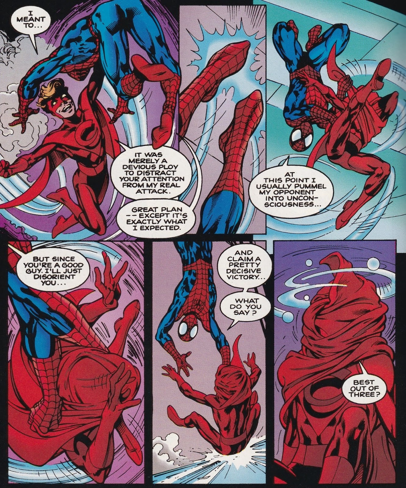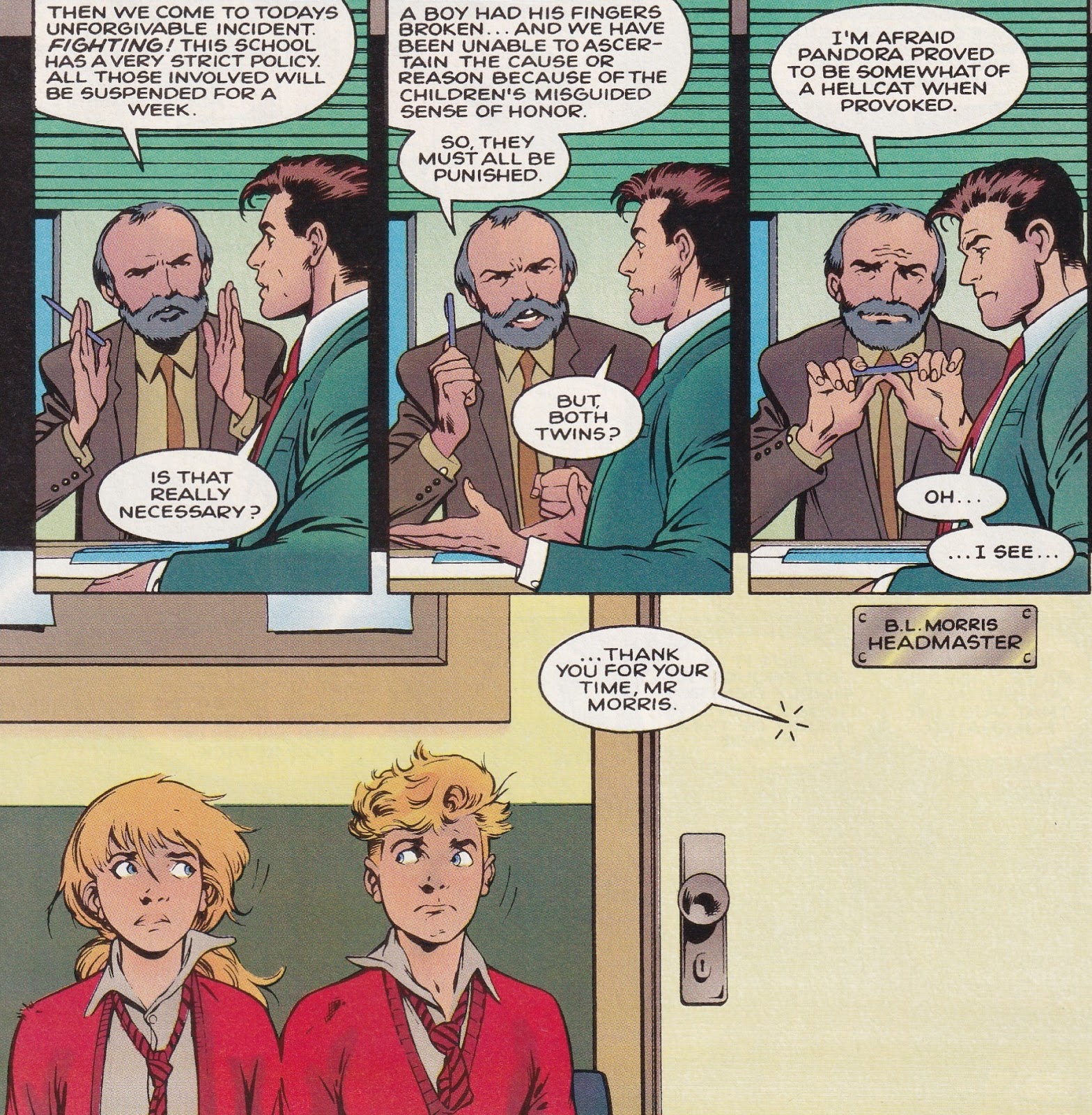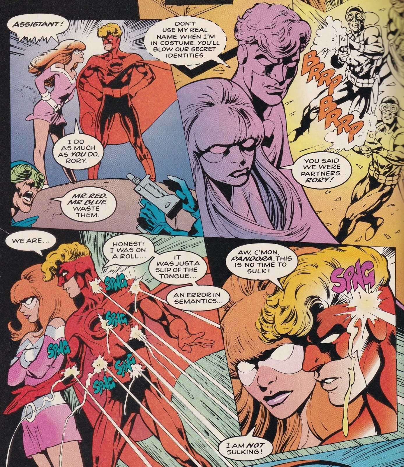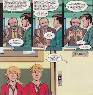I have mentioned the obvious love Davis puts into the work. The art is staggering – it’s Alan Davis, after all – but because these are his own creations, the vibrancy really shines through more than it does on some of his other work. He makes some very nice choices about what to show and what not to show, and does good work with sound effects. When Spider-Man first appears, we simply see thugs disappearing off-panel, and Rory and Pandora swiveling their heads to follow the action, and Davis uses lots of cool sound effects – “thwiiipp,” “smak,” “wud,” “thwiiipp,” “wak,” “wap,” “thwiiipp,” “thwiiipp.” (For the uninitiated, those are the sound of Spidey’s webbing, and the three “i”s are very important!) The reaction of the kids is what’s important; we’ve all seen Spider-Man web bad guys up before, but the sheer amazement on the kids’ faces is what makes the scene. (On the next page, the final one of the issue, when they see Spidey in all his web-slinging glory, they say “Amazing!” and “Spectacular!”, a nice nod to his two books at the time.) They react the way we would, even though they have powers of their own. The whole book is like that – an examination of what it would be like to be children and suddenly discover you’re blessed with these fantastic powers.