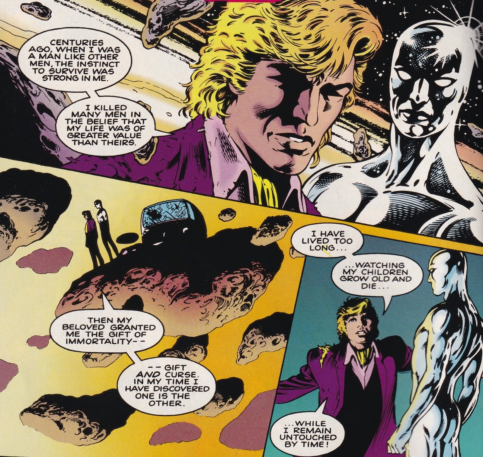 The creatures manage to kill a few of the clan, but the rest band together to fight back. Meanwhile, in space, the Silver Surfer happens across a Volkswagen van painted hippie-style, which contains a still living Adam Destine. Needless to say, Mr. Surfer is quite surprised. (And we should ignore the fact that in the Marvel and DC Universes, people are always stumbling across each other in space even though it’s pretty stinkin’ huge.) Adam needs the Surfer’s help to get back to Earth so he can help his family. Meanwhile, said family discovers that they are being attacked because Rory and Pandora inadvertently took a machine – called the GRYPHON – that can “remodel a fully developed organism, irrespective of age or genetic composition.” Pretty neat! Two different people want this – a mad scientist with flawed genes, and a creature we saw at the very beginning of the book – when A.I.M. showed up – an experiment gone wrong, one that turned him into a “super-advanced prehistoric beast.” Both of these dudes want the machine so they can change who they are – the doctor, presumably, to fix his condition, and the monster (his name is Lenz) to create more of his kind because he fears extinction. The clan fights Lenz, but in the end, he defeats them, until he meets Adam, who is far more powerful than he. Adam, however, lets him go – he understands what it’s like to be alone and the only one of your kind. It’s an interesting choice.