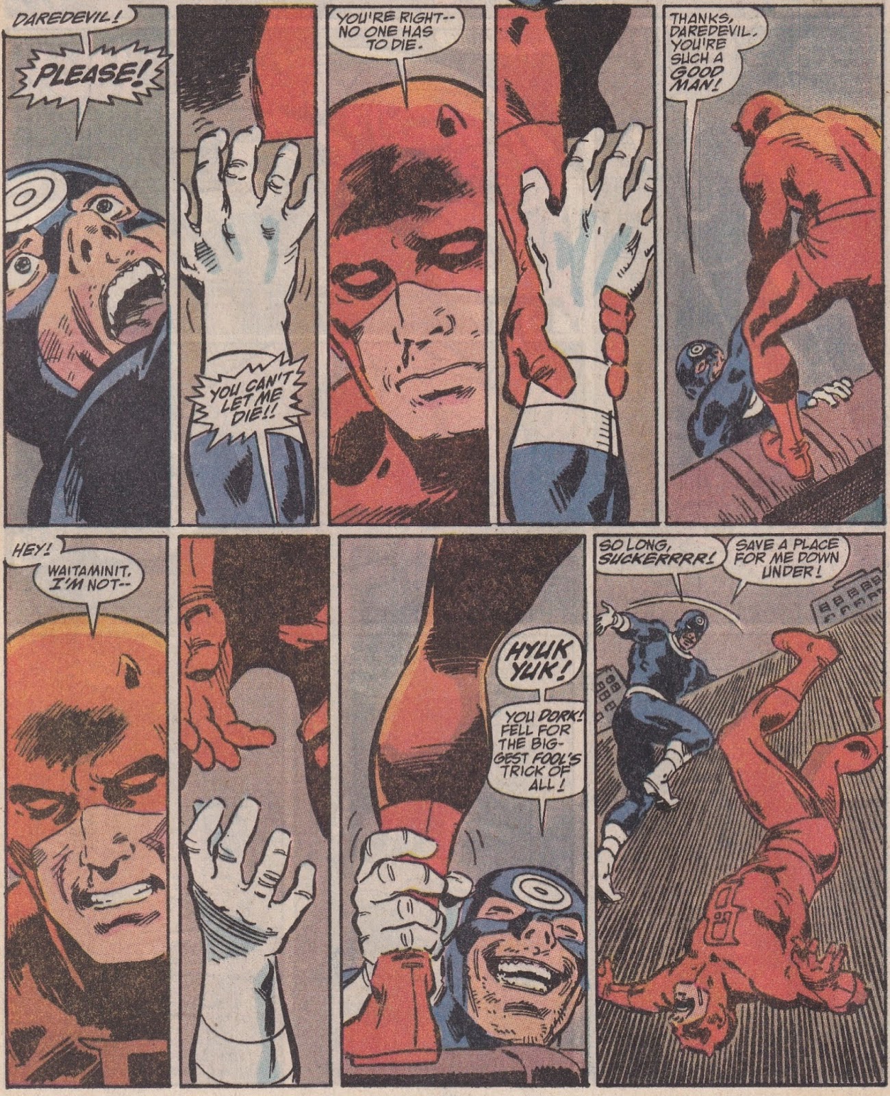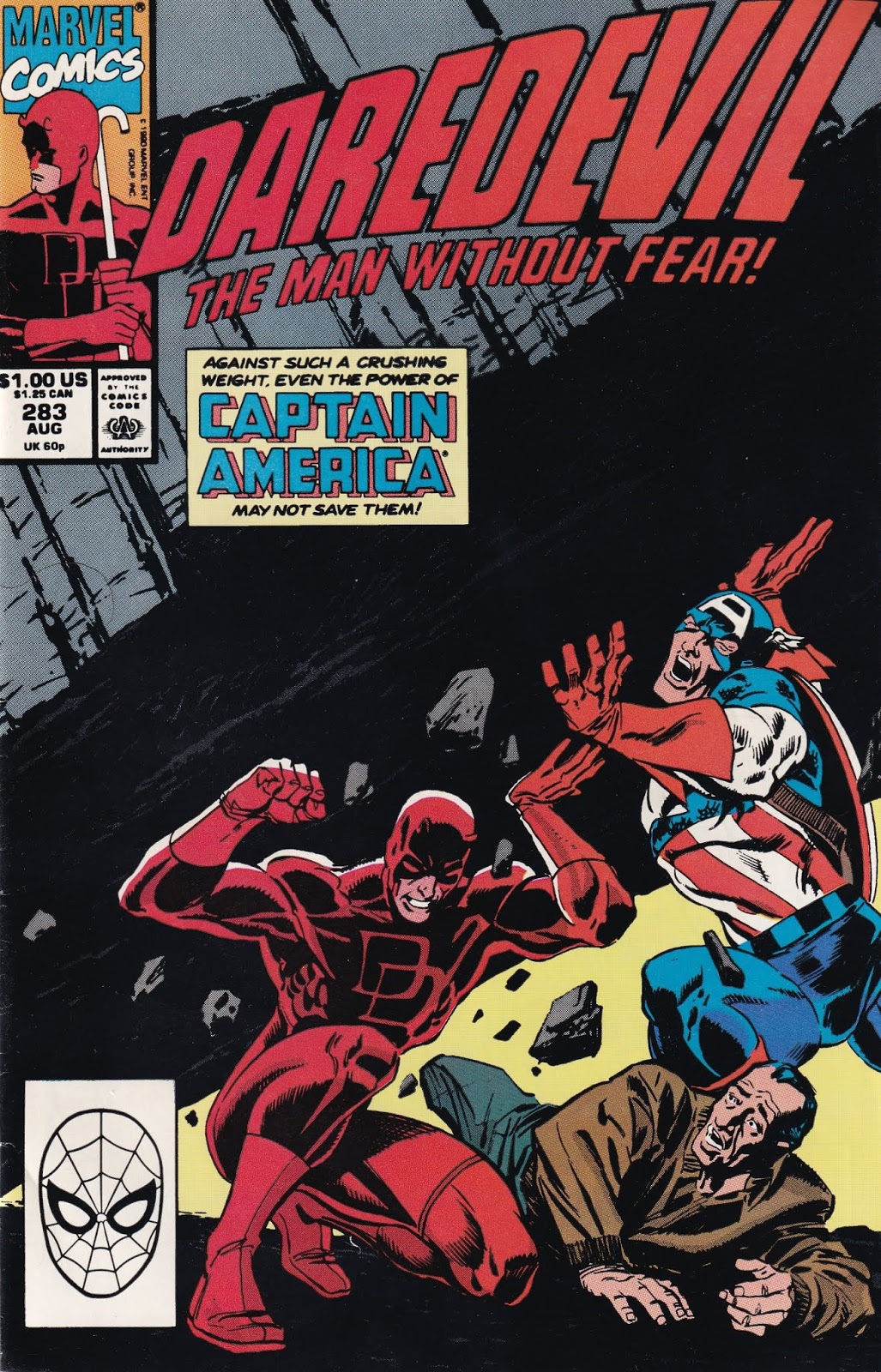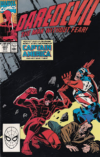 The most annoying of Nocenti’s polemical issues, actually, is the first one I think you should own. Issue #283 is a bit of a fill-in, as Matt gets out of Hell, says goodbye to the Inhumans, and wanders off. He ends up in a small town where, in a coincidence that can only occur in a comic-book universe, Captain America happens to be. The good Captain is going through his own “crisis of faith,” as he believes the American values he fought for are being undermined. This depiction of Captain America I have a bit more of a problem with, not because I disagree with his politics – I also believe the drug war is a foolish thing that hurts low-income users more than it hurts high-income dealers – but because it seems so imposed by writer fiat, and not even the writer of his regular book. His rant on page 4 feels like something Nocenti wanted to say, so she put it in Steve’s mouth. It feels phony. The whole story feels that way – like a Sermon on the Mount. In this small town, an immigrant has created a flying car that runs on garbage. Of course, this is a threat to the big car companies and their pals in the U.S. government, so they try to intimidate the defenseless immigrant both “legally” and by sending thugs to his house. The thugs succeed in destroying the car (which is a prototype and was built without plans), despite Daredevil and Captain America protecting it, and the immigrant (Viktor) leaves, seemingly to commit suicide by leaping from a building in town. At the last moment, we see that he has built a jetpack and can fly, proving once again that the Dream of America cannot die even if the mean government wants to destroy it.