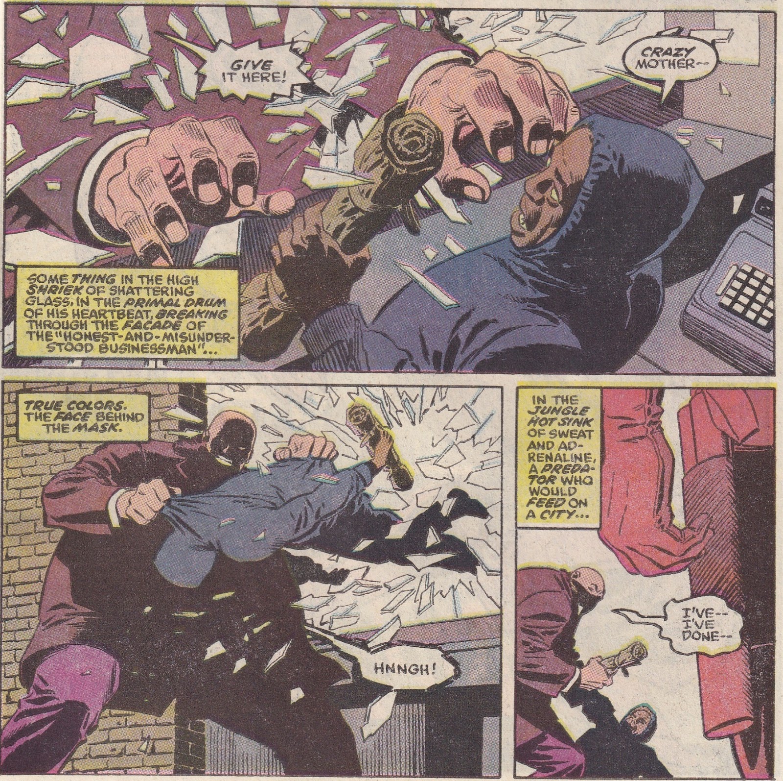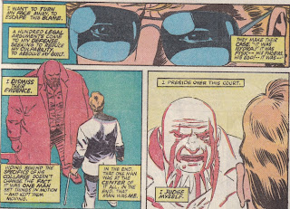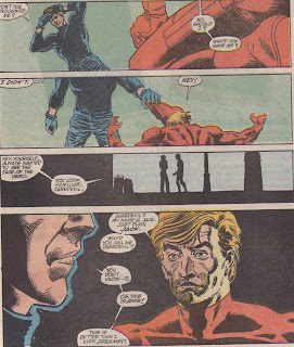 As I mentioned, Matt is dealing with this race/class dichotomy in his own way. He and Nyla break into a penthouse and begin to rob it, but Matt, despite his amnesia, is a decent fellow, and he decides it’s wrong. Nyla can’t believe it; the place they’re robbing belongs to a guy who made a fortune in junk bonds, while welfare for working mothers in Harlem is cut. She asks Murdock where the justice is, and he really doesn’t have a good answer for her, except that it’s wrong. Matt is concerned with justice, but what kind of justice? If it’s the justice that comes from the law, then Nyla wants nothing to do with it, because the law has been written to keep her – not the black her, but the poor her – down. Matt can’t see that his law, the foundation of his belief system, might be corrupt, and therefore the entire system is corrupt. All he can do is turn away and go visit the judge, who, it turns out, could have used his protection a little sooner. The interesting thing about this entire vignette is not that Nyla is right – that’s something for sociologists to argue – but that Matt is so clearly wrong. Wrong at least in the sense that he can’t realize that his precious law has utterly failed this young woman, and wrong in that it has also failed Marcus and his father, even though they appear to be on the “right” side of the law. Superheroes aren’t supposed to be wrong, but Matt is, and he fails Nyla, the judge, and Marcus – all black people.