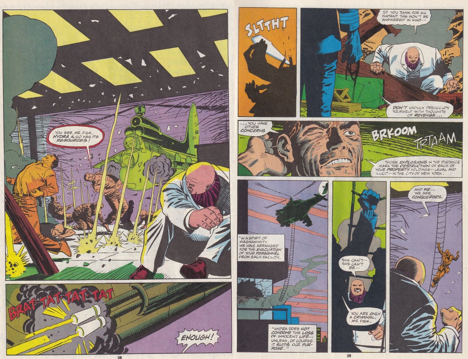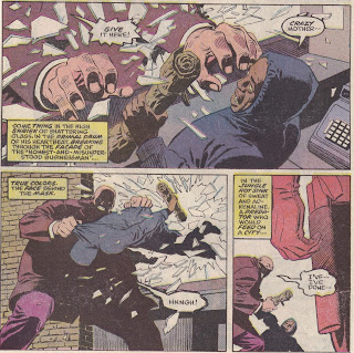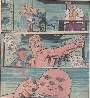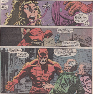 The way he takes down Typhoid makes us realize that Chichester is not writing this like a typical superhero book. He wants to deal with Matt’s feelings toward women, his feelings toward his arch-nemesis, and his Catholic upbringing. Therefore, Matt turns the table on the “Typhoid” aspect of Mary’s personality. Typhoid is always the aggressor, but by being aggressive himself, Matt catches her off-guard. She is confused when confronted with a sexually aggressive (not in a violent way) male, someone who matches her power and forthrightness. When Matt takes the initiative, the real Mary, the shy one, comes out again, as that’s all Mary ever wanted – someone to take care of her. She had to create Typhoid to do this, and when she thinks Matt will take over that role, she retreats back into the shy girl. Matt knew this would happen, and called Social Services to take her away while she was less of a danger. It’s a sad scene when Matt ruminates on what he’s done; he looks down at the sleeping girl, now no threat to anyone, and thinks, “It’s easy to forgive the real Mary the sins of her dark half … I only hope she can forgive me mine…” The idea of forgiveness, and who forgives and whether those who are forgiven deserve it, has come up before, in Nocenti’s treatment of Bullseye, and Chichester will return to it again. Matt’s Catholicism is an interesting part of his character, and although occasionally a Catholic writer will pound us between the eyes with it (if you’re thinking of Kevin Smith, so am I), it’s nice to see a writer incorporate it into his personality without making it the overwhelming factor in what he does. Matt’s destruction of Typhoid juxtaposes nicely with his brutal treatment of Wilson Fisk in the later issues.