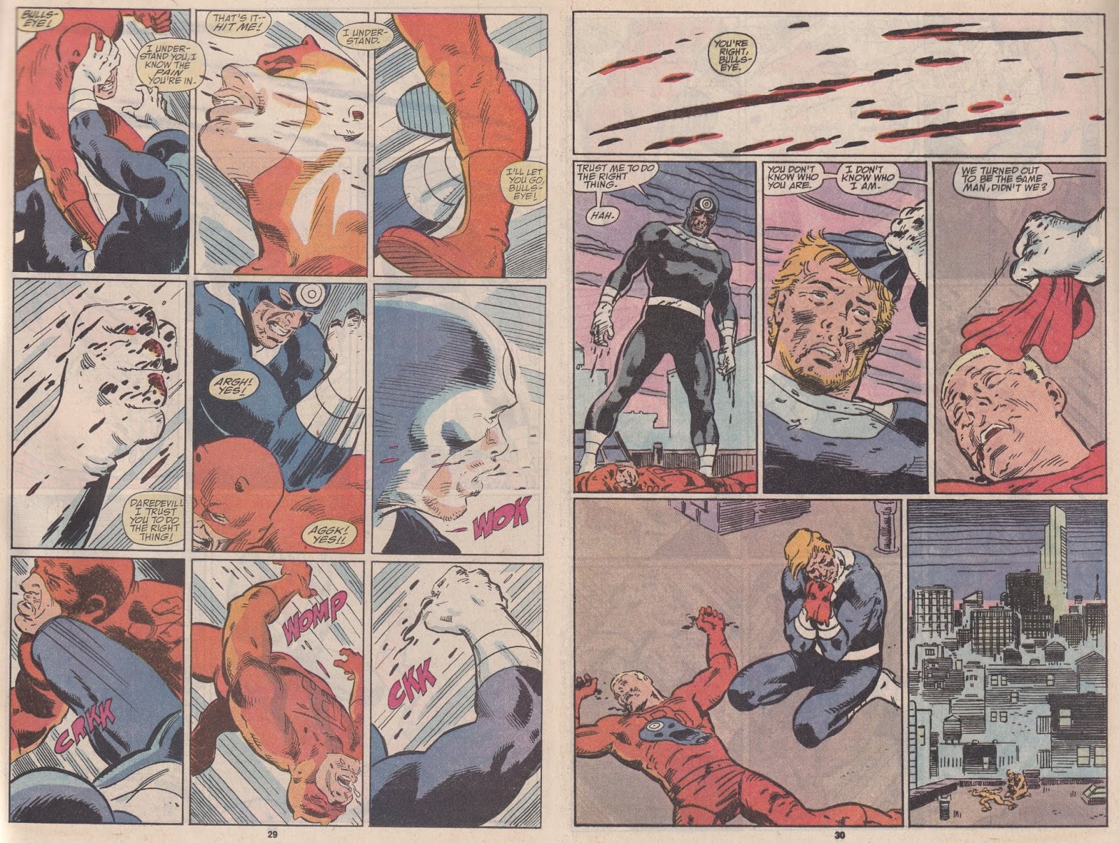 The final stage of Matt getting his memory back is when he becomes a boxer in order to show Nyla that she doesn’t need to steal to make a living. He blindfolds himself and becomes a sensation. Wilson Fisk, not understanding that Matt has lost his memory, decides to screw with Matt’s mind once again, and sets up a situation exactly like the one Matt’s father found himself in. Fisk’s plan backfires (of course) when the scene jolts Matt’s memory and he regains the knowledge of who he is. He thinks for a time that he is his father, but then he realizes that his father played out the same scenario years earlier and that he watched it happen. This brings his memory back and he rescues Nyla, who had been kidnapped to ensure Murdock’s complicity. With the return of his memory, he confronts the Kingpin, setting up Chichester’s run nicely as he tells Fisk his empire is over, but first he has to undo the damage that Bullseye has done in his name. Issue #290 is the “final” conflict between Bullseye and Daredevil. It’s a marvelous fight issue, mainly because Bullseye is still wearing the devil costume, so Matt puts on Bullseye’s costume and they switch roles for the fight. As both are struggling with their identities, they fight and argue over who exactly is who. There’s a nice sequence when Matt, dressed as Bullseye, falls off a ledge and Bullseye (dressed as Daredevil) grabs his arm. When Matt appeals to “Daredevil” for help, there’s a beautiful panel by Dwyer in which “Daredevil” says: “You’re right – no one has to die.” Bullseye has gotten so into his persona that he no longer knows who he is and what he usually does. As he remembers that he’s a bad guy, “Bullseye” grabs “Daredevil” and hurls him off the roof. As we realize that Bullseye is the one who is being compassionate and Matt is the one who is being evil, it jolts us because this is not how these men should act. Matt is acting out because he wants to confuse Bullseye and make him doubt, but it’s still unsettling. He baits “Daredevil” into mocking him because he, “Bullseye,” has never been able to kill him, and this makes “Daredevil” uncertain, because he knows he’s not really Daredevil. The final beatdown, a nine-panel page of brutality, is exquisite because we’re not exactly sure who’s talking. The two men have become so entwined that it no longer matters – they are the same, and all that matters is who can triumph in a test of brute strength. The last page is poignant; Matt pulls off his Bullseye mask and says: “You don’t know who you are. I don’t know who I am.” He then takes his mask back and says: “We turned out to be the same man, didn’t we?” This is a powerful ending to a twisted and disturbing story, and it mitigates a lot of Nocenti’s ham-fisted storytelling from earlier issues. She has led us to this point, and although we may have been annoyed with some of the turns along the way, the ending more than makes up for it. It feels like a final issue, but Nocenti returns one more time, and in issue #291, she brings Matt and Foggy back together and also sets up Chichester’s run. This was time when writers didn’t necessarily put their stamp on books (some did, but not as much as today) with cataclysmic beginnings and endings. Nocenti’s final issue is a nice way to end, but it doesn’t destroy the status quo, and in fact it offers Chichester some nice toys to play with. Nocenti shows some of the Kingpin’s moves toward “legitimate” business, as he begins to look to the entertainment and news sector. In this issue, we get more interesting interplay among the principals, and Bullet has some nice scenes, which help humanize him and help us gain some understanding into why he is the way he is. J. Jonah Jameson and Ben Urich have some nice interaction, although Jameson’s change of heart is telegraphed far too easily. Still, Nocenti’s themes of the rich and powerful getting their way are still woven into the fabric of the book, and she has gotten to the point where she doesn’t need to beat us over the head with them. It’s a much more subtle book than #283, and that had been less than a year before. It’s a nice way to go.