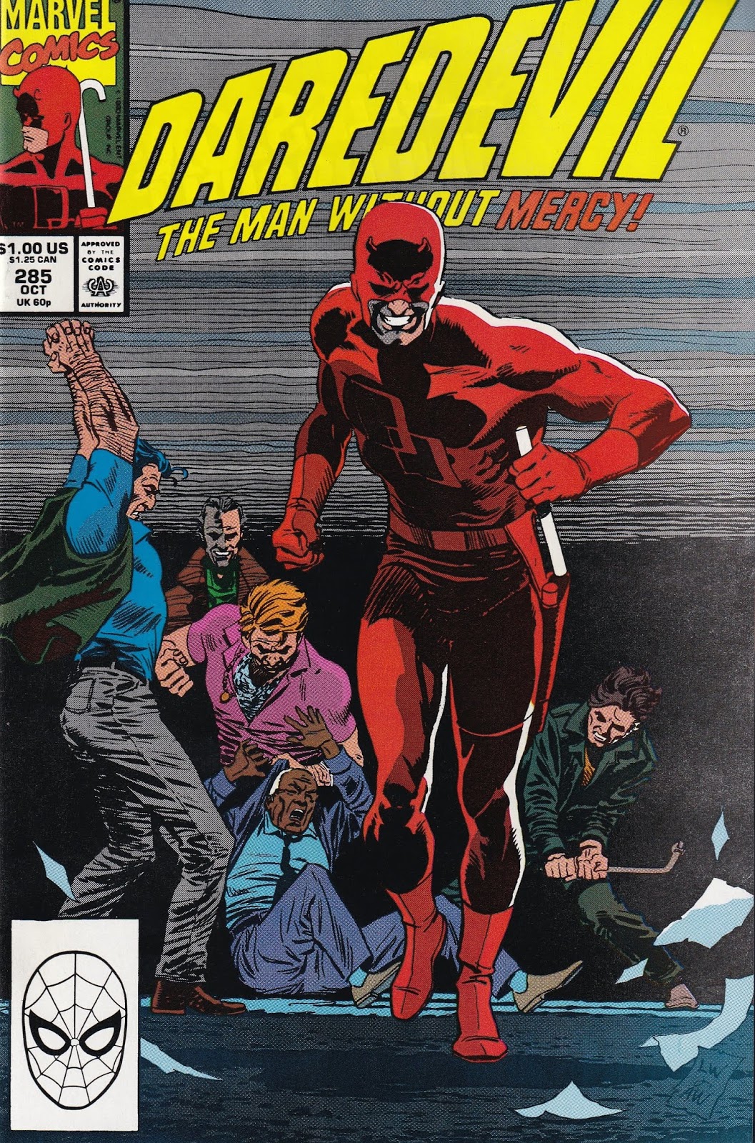 Issue #284 begins Nocenti’s final storyline with Daredevil, and in it she decides to examine the nature of heroism and why Matt is indeed a hero. She also wants to look at how race affects our perception of people and politics. That’s a subplot, though, to the main thrust of her story – the yin and yang of Daredevil and Bullseye. Every hero needs a nemesis, after all, and it’s far too easy to ignore the similarities between the hero and the nemesis. Writers have explored this duality, but not too often, especially 20 years ago [Edit: these days, when it’s been 30 years since this run, it’s too common to note the similarities between hero and villain. The pendulum swings!]. Nocenti dives right in, and provides us with no easy answers. In issue #284, Matt loses his memory. Amnesia is a silly plot device and doesn’t work the way Nocenti says it does, but we simply move on because we recognize it as a MacGuffin and don’t worry about it. We can accept it because Matt has literally been to Hell, so we can understand why he might want to forget it. He hallucinates and begins to doubt who he is, and in an interesting scene, he stops fighting because he recognizes the futility of it all. This leads to Bullseye taking his identity, and Matt becoming “Jack” Murdock. Jack doesn’t know he’s blind (not right away, but he figures it out) and doesn’t know who he is. These two men explore who they are and why they do what they do. Bullseye is, of course, a few bricks shy of a load himself, and taking Daredevil’s identity messes him up even more. He isn’t sure if he is a hero or a villain. He wants to destroy Daredevil’s image, so he starts stealing. He screws up, however, by giving the money to the poor, just like Robin Hood. This endears him even more to the populace, so he has to go even further. He turns to street murders in an effort to drag Daredevil’s name through the mud. This smear campaign works on the New York media, with the exception of Ben Urich, who is convinced something is horribly wrong. Bullseye is an interesting character here. He is clearly insane, but that doesn’t mean he doesn’t offer some insight into what makes Daredevil tick. Is Murdock crazy for putting on tights and fighting crime? Bullseye certainly seems to think so. He understands the rush of being a vigilante, but being who he is, he can’t understand why Matt doesn’t turn to theft and murder.