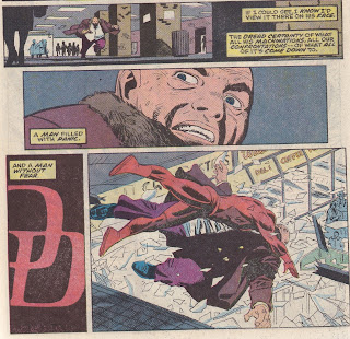 By the time he has his final confrontation with Murdock, he no longer has his own identity – he has become lost in the “Daredevil” identity and can’t get out. He’s locked into the persona, and only a beating by Murdock can possibly get him out of it.